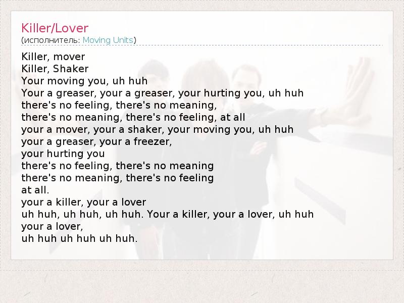 Killer, mover Killer, Shaker Your moving you, uh huh Your a greaser, your a greaser, your hurting you, uh huh there's no feeling, there's no meaning, there's no meaning, there's no feeling, at all your a mover, your a shaker, your moving you, uh huh your a greaser, your a freezer, your hurting you there's no feeling, there's no meaning there's no meaning, there's no feeling at all. your a killer, your a lover uh huh, uh huh, uh huh. Your a killer, your a lover, uh huh your a lover, uh huh uh huh uh huh.