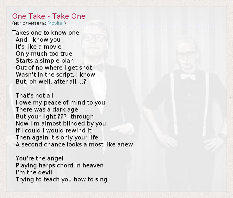 А как ты думаешь, о чем песня "One Take - Take One" ?