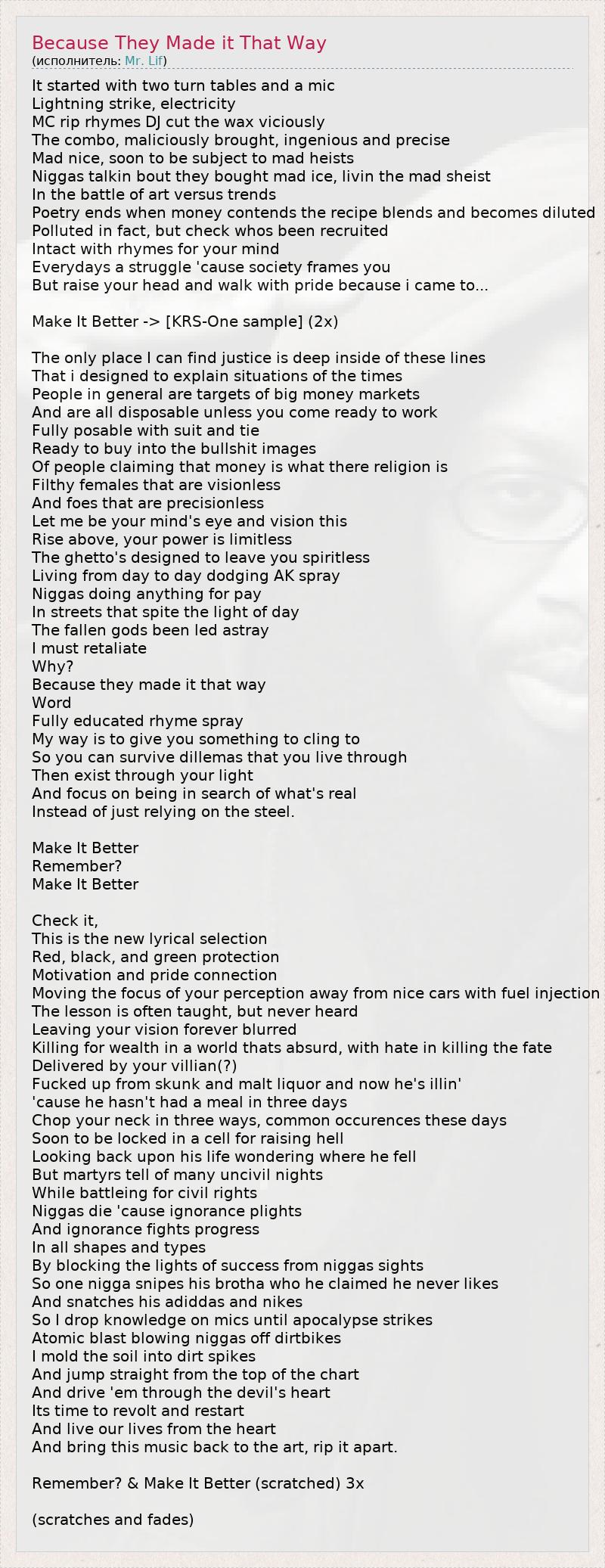 It started with two turn tables and a mic Lightning strike, electricity MC rip rhymes DJ cut the wax viciously The combo, maliciously brought, ingenious and precise Mad nice, soon to be subject to mad heists Niggas talkin bout they bought mad ice, livin the mad sheist In the battle of art versus trends Poetry ends when money contends the recipe blends and becomes diluted Polluted in fact, but check whos been recruited Intact with rhymes for your mind Everydays a struggle 'cause society frames you But raise your head and walk with pride because i came to... Make It Better -> [KRS-One sample] (2x) The only place I can find justice is deep inside of these lines That i designed to explain situations of the times People in general are targets of big money markets And are all disposable unless you come ready to work Fully posable with suit and tie Ready to buy into the bullshit images Of people claiming that money is what there religion is Filthy females that are visionless And foes that are precisionless Let me be your mind's eye and vision this Rise above, your power is limitless The ghetto's designed to leave you spiritless Living from day to day dodging AK spray Niggas doing anything for pay In streets that spite the light of day The fallen gods been led astray I must retaliate Why? Because they made it that way Word Fully educated rhyme spray My way is to give you something to cling to So you can survive dillemas that you live through Then exist through your light And focus on being in search of what's real Instead of just relying on the steel. Make It Better Remember? Make It Better Check it, This is the new lyrical selection Red, black, and green protection Motivation and pride connection Moving the focus of your perception away from nice cars with fuel injection The lesson is often taught, but never heard Leaving your vision forever blurred Killing for wealth in a world thats absurd, with hate in killing the fate Delivered by your villian(?) Fucked up from skunk and malt liquor and now he's illin' 'cause he hasn't had a meal in three days Chop your neck in three ways, common occurences these days Soon to be locked in a cell for raising hell Looking back upon his life wondering where he fell But martyrs tell of many uncivil nights While battleing for civil rights Niggas die 'cause ignorance plights And ignorance fights progress In all shapes and types By blocking the lights of success from niggas sights So one nigga snipes his brotha who he claimed he never likes And snatches his adiddas and nikes So I drop knowledge on mics until apocalypse strikes Atomic blast blowing niggas off dirtbikes I mold the soil into dirt spikes And jump straight from the top of the chart And drive 'em through the devil's heart Its time to revolt and restart And live our lives from the heart And bring this music back to the art, rip it apart. Remember? & Make It Better (scratched) 3x (scratches and fades)