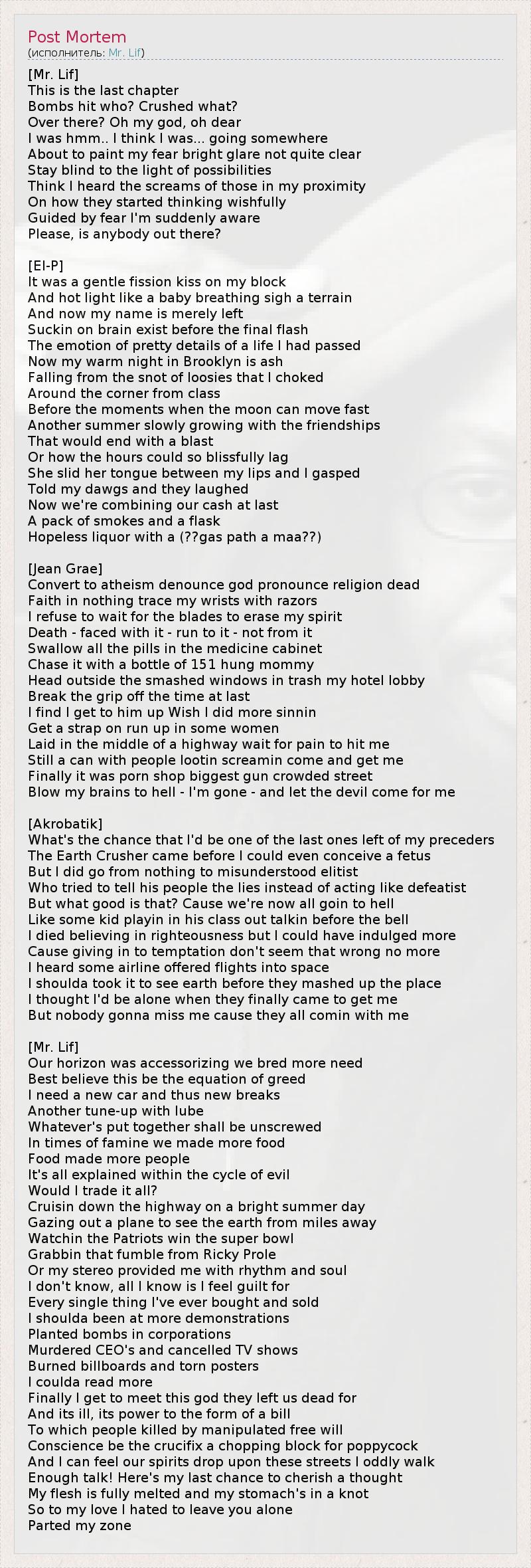 [Мистер. Лиф ] Этопоследняя глава Бомб ударил кто? Щебень и что? Там? Боже мой, боже мой Я хм .. я думаю, что я ... куда-то О том, чтобы нарисовать свой страх ярком свете не совсем понятно, Пребывание слепой к свету возможностей Думаю, что я услышал крики тех, кто в моей близости О том, как они начали думать мечтательно Руководствуясь страха я внезапно понял, Пожалуйста , кто-нибудь там? [ El- P] Это былонежным поцелуем деления на моем блоке И горячая свет , как ребенок дыхания вздох местности А теперь мое имя просто осталось Чертов на мозг существовать до окончательного вспышки Эмоции симпатичных деталей жизни я прошел Теперь моя теплая ночь в Бруклине пепельно Падение с соплями из Loosies , что я сдавленным За углом от класса Перед моменты, когдаЛуна может быстро двигаться Еще летом медленно растет с дружбой Это было закончиться взрывом Или , как часы, могут так блаженно отставать Она сунула язык между моих губ и я ахнула Сказали, что мой Dawgs и они смеялись Теперь мы Объединив наши деньги , наконец, Пакет дымов и колбу Безнадежный щелок с (путь ?? газаMAA ?? ) [ Жан Грей ] Преобразовать в атеизме денонсировать бога произнести слово религия мертвых Вера в ничто проследить мои запястья с бритвами Я отказываюсь ждать лезвия , чтобы стереть мой дух Смерть - столкнулись с ним - работать с ней - не от него Ласточка все таблетки в аптечке Преследовать его с бутылкой 151 подвешенный мама Руководитель пределами разбитых окон в мусорное ведро мой отель лобби Перерыв сцепление выключения время наконец Я нахожу, что я до него добраться до жаль, что я больше sinnin Получитьремень на бегу в некоторых женщин Лежала в середине шоссе ждать боли , чтобы ударить меня Тем не менееможно с людей lootin Screamin прийти и получить меня Наконец это было порно магазин большой пушки людной улице Удар мои мозги в ад - я уйду - и пустьдьявол придет за мной [ Akrobatik ] Чтошанс , что я буду одним из последних оставшихся моих preceders Земля дробилка пришли , прежде чем я мог даже представить себе зародыш Но я пошел от нуля до неправильно элитарным Кто пытался говорить со своим народом ложь вместо того чтобы действовать как пораженческие Но что хорошего в том , что ? Потому что мы сейчас все идешь в ад Как -то ребенок играю в своем классе из говоришь до звонка Я умер верить в праведность , но я мог бы занимался больше Причина не поддаваясь искушению не показаться, что неправильно не более Я слышал, некоторые авиакомпании , предлагаемые полеты в космос Я Shoulda взял его, чтобы увидеть землю , прежде чем они пюре место Я думал, что я один, когда они, наконец, пришел за мной Но никто не будет не хватать меня, потому что все пущу они со мной [Мистер. Лиф ] Наша горизонт аксессуарами мы больше усилило необходимость Лучший считаю, что это будетуравнение жадности Мне нужен новый автомобиль и , таким образом, новые льготы Еще настройка с машинным маслом Что бы ни собрали , должны быть отвинтил Во времена голода мы сделали больше пищи Пища, приготовленная больше людей Это все объяснить в рамках цикла зла Буду ли я торговать все это ? Бренчание вниз по шоссе на яркий летний день Глядя из самолет, чтобы увидеть землю издалека Смотрю патриотов выиграть Супер Боул Grabbin , что тратить время с Рикки PROLE Или моя стерео предоставил мне ритма и души Я не знаю, все, что я знаю, я чувствую вину за то, Каждая вещь я когда-либо покупал и продавал Я Shoulda