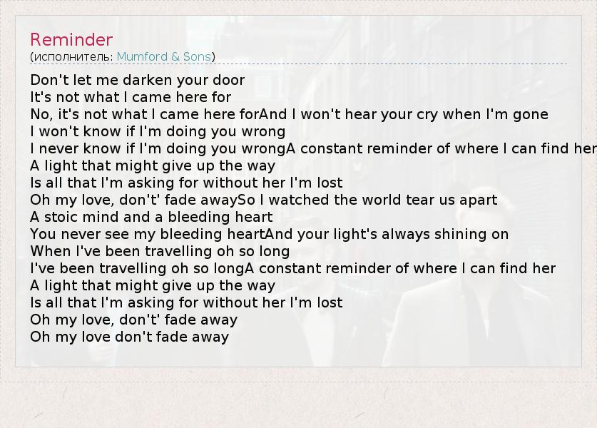 Don't let me darken your door It's not what I came here for No, it's not what I came here forAnd I won't hear your cry when I'm gone I won't know if I'm doing you wrong I never know if I'm doing you wrongA constant reminder of where I can find her A light that might give up the way Is all that I'm asking for without her I'm lost Oh my love, don't' fade awaySo I watched the world tear us apart A stoic mind and a bleeding heart You never see my bleeding heartAnd your light's always shining on When I've been travelling oh so long I've been travelling oh so longA constant reminder of where I can find her A light that might give up the way Is all that I'm asking for without her I'm lost Oh my love, don't' fade away Oh my love don't fade away