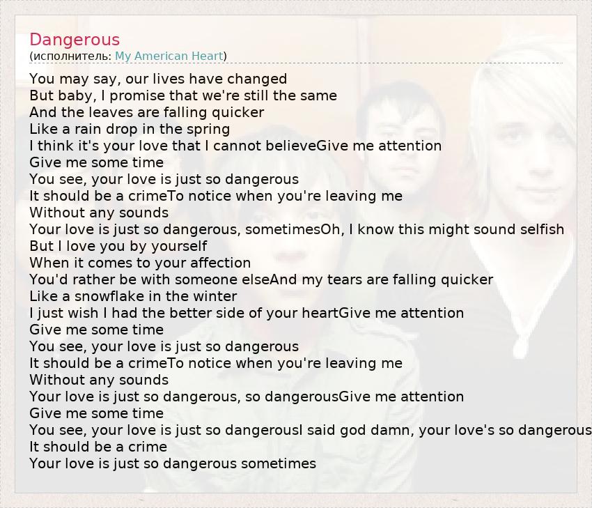 You may say, our lives have changed But baby, I promise that we're still the same And the leaves are falling quicker Like a rain drop in the spring I think it's your love that I cannot believeGive me attention Give me some time You see, your love is just so dangerous It should be a crimeTo notice when you're leaving me Without any sounds Your love is just so dangerous, sometimesOh, I know this might sound selfish But I love you by yourself When it comes to your affection You'd rather be with someone elseAnd my tears are falling quicker Like a snowflake in the winter I just wish I had the better side of your heartGive me attention Give me some time You see, your love is just so dangerous It should be a crimeTo notice when you're leaving me Without any sounds Your love is just so dangerous, so dangerousGive me attention Give me some time You see, your love is just so dangerousI said god damn, your love's so dangerous It should be a crime Your love is just so dangerous sometimes