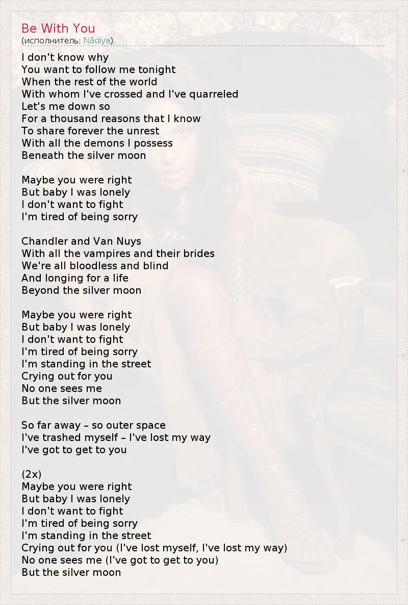 I don't know why You want to follow me tonight When the rest of the world With whom I've crossed and I've quarreled Let's me down so For a thousand reasons that I know To share forever the unrest With all the demons I possess Beneath the silver moon Maybe you were right But baby I was lonely I don't want to fight I'm tired of being sorry Chandler and Van Nuys With all the vampires and their brides We're all bloodless and blind And longing for a life Beyond the silver moon Maybe you were right But baby I was lonely I don't want to fight I'm tired of being sorry I'm standing in the street Crying out for you No one sees me But the silver moon So far away – so outer space I've trashed myself – I've lost my way I've got to get to you (2х) Maybe you were right But baby I was lonely I don't want to fight I'm tired of being sorry I'm standing in the street Crying out for you (I've lost myself, I've lost my way) No one sees me (I've got to get to you) But the silver moon