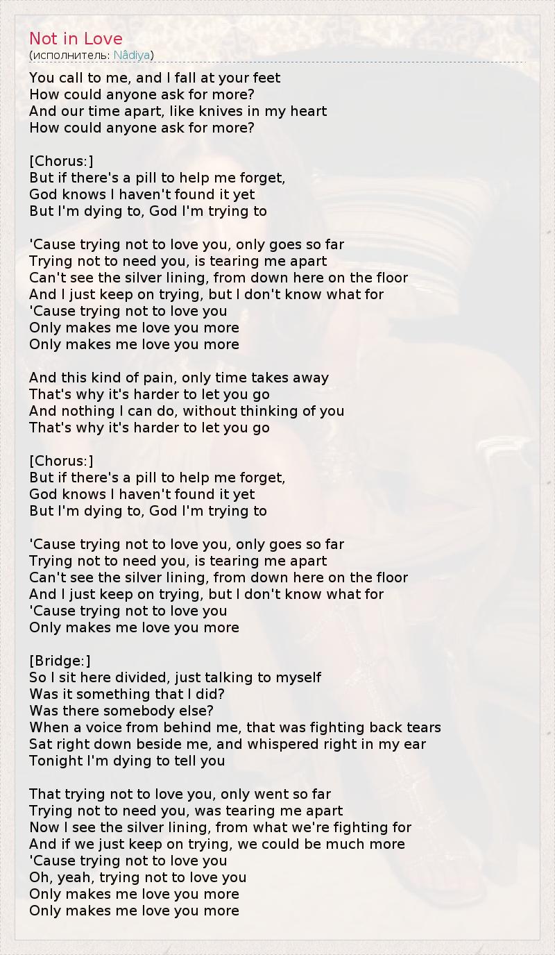 You call to me, and I fall at your feet How could anyone ask for more? And our time apart, like knives in my heart How could anyone ask for more? [Chorus:] But if there's a pill to help me forget, God knows I haven't found it yet But I'm dying to, God I'm trying to 'Cause trying not to love you, only goes so far Trying not to need you, is tearing me apart Can't see the silver lining, from down here on the floor And I just keep on trying, but I don't know what for 'Cause trying not to love you Only makes me love you more Only makes me love you more And this kind of pain, only time takes away That's why it's harder to let you go And nothing I can do, without thinking of you That's why it's harder to let you go [Chorus:] But if there's a pill to help me forget, God knows I haven't found it yet But I'm dying to, God I'm trying to 'Cause trying not to love you, only goes so far Trying not to need you, is tearing me apart Can't see the silver lining, from down here on the floor And I just keep on trying, but I don't know what for 'Cause trying not to love you Only makes me love you more [Bridge:] So I sit here divided, just talking to myself Was it something that I did? Was there somebody else? When a voice from behind me, that was fighting back tears Sat right down beside me, and whispered right in my ear Tonight I'm dying to tell you That trying not to love you, only went so far Trying not to need you, was tearing me apart Now I see the silver lining, from what we're fighting for And if we just keep on trying, we could be much more 'Cause trying not to love you Oh, yeah, trying not to love you Only makes me love you more Only makes me love you more