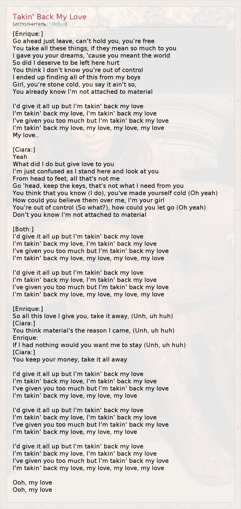 [Enrique:] Go ahead just leave, can't hold you, you're free You take all these things, if they mean so much to you I gave you your dreams, 'cause you meant the world So did I deserve to be left here hurt You think I don't know you're out of control I ended up finding all of this from my boys Girl, you're stone cold, you say it ain't so, You already know I'm not attached to material I'd give it all up but I'm takin' back my love I'm takin' back my love, I'm takin' back my love I've given you too much but I'm takin' back my love I'm takin' back my love, my love, my love, my love My love.. [Ciara:] Yeah What did I do but give love to you I'm just confused as I stand here and look at you From head to feet, all that's not me Go 'head, keep the keys, that's not what I need from you You think that you know (I do), you've made yourself cold (Oh yeah) How could you believe them over me, I'm your girl You're out of control (So what?), how could you let go (Oh yeah) Don't you know I'm not attached to material [Both:] I'd give it all up but I'm takin' back my love I'm takin' back my love, I'm takin' back my love I've given you too much but I'm takin' back my love I'm takin' back my love, my love, my love, my love I'd give it all up but I'm takin' back my love I'm takin' back my love, I'm takin' back my love I've given you too much but I'm takin' back my love I'm takin' back my love, my love, my love, my love [Enrique:] So all this love I give you, take it away, (Unh, uh huh) [Ciara:] You think material's the reason I came, (Unh, uh huh) Enrique: If I had nothing would you want me to stay (Unh, uh huh) [Ciara:] You keep your money, take it all away I'd give it all up but I'm takin' back my love I'm takin' back my love, I'm takin' back my love I've given you too much but I'm takin' back my love I'm takin' back my love, my love, my love I'd give it all up but I'm takin' back my love I'm takin' back my love, I'm takin' back my love I've given you too much but I'm takin' back my love I'm takin' back my love, my love, my love I'd give it all up but I'm takin' back my love I'm takin' back my love, I'm takin' back my love I've given you too much but I'm takin' back my love I'm takin' back my love, my love, my love, my love Ooh, my love Ooh, my love