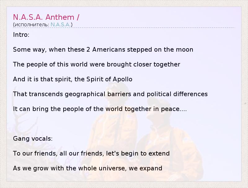 А как ты думаешь, о чем песня "N.A.S.A. Anthem /" ?