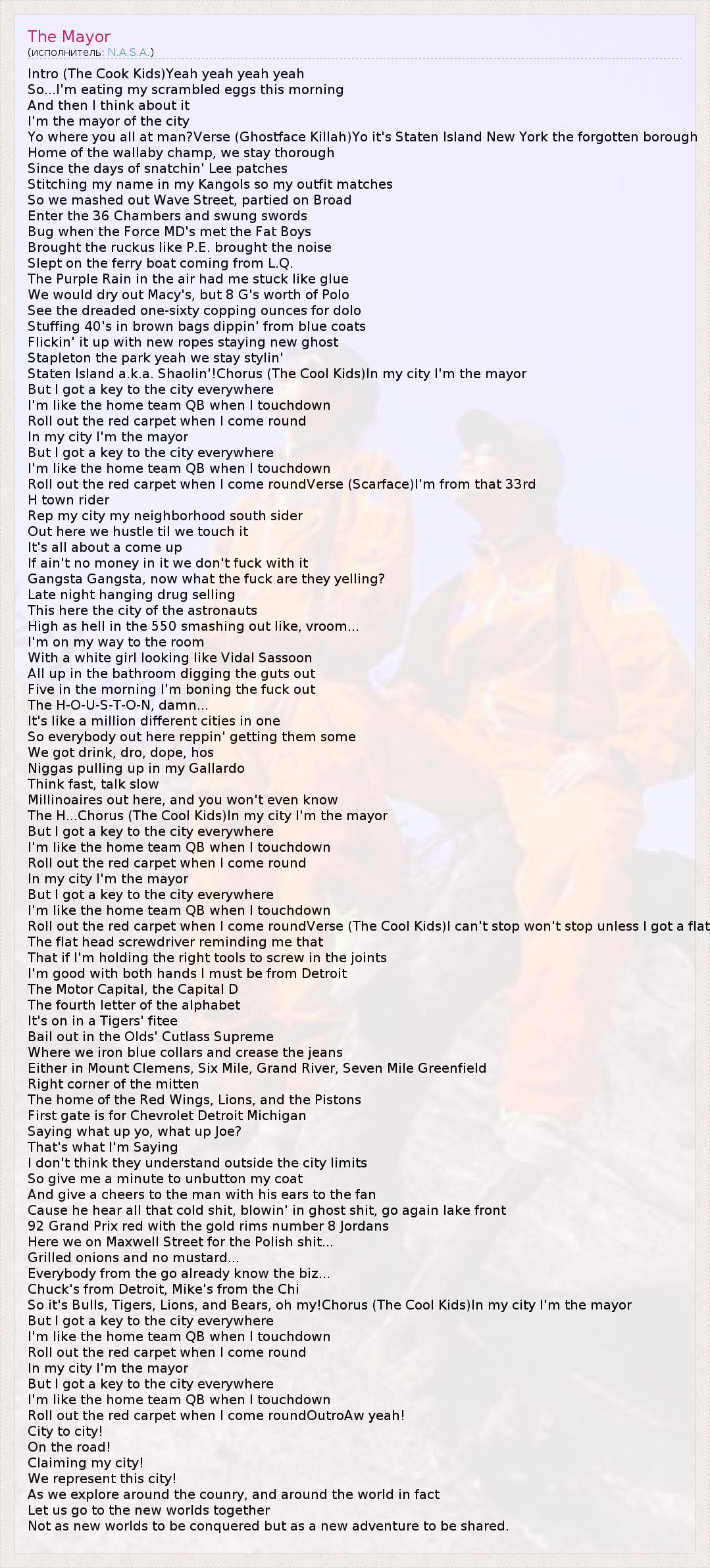 Intro (The Cook Kids)Yeah yeah yeah yeah So...I'm eating my scrambled eggs this morning And then I think about it I'm the mayor of the city Yo where you all at man?Verse (Ghostface Killah)Yo it's Staten Island New York the forgotten borough Home of the wallaby champ, we stay thorough Since the days of snatchin' Lee patches Stitching my name in my Kangols so my outfit matches So we mashed out Wave Street, partied on Broad Enter the 36 Chambers and swung swords Bug when the Force MD's met the Fat Boys Brought the ruckus like P.E. brought the noise Slept on the ferry boat coming from L.Q. The Purple Rain in the air had me stuck like glue We would dry out Macy's, but 8 G's worth of Polo See the dreaded one-sixty copping ounces for dolo Stuffing 40's in brown bags dippin' from blue coats Flickin' it up with new ropes staying new ghost Stapleton the park yeah we stay stylin' Staten Island a.k.a. Shaolin'!Chorus (The Cool Kids)In my city I'm the mayor But I got a key to the city everywhere I'm like the home team QB when I touchdown Roll out the red carpet when I come round In my city I'm the mayor But I got a key to the city everywhere I'm like the home team QB when I touchdown Roll out the red carpet when I come roundVerse (Scarface)I'm from that 33rd H town rider Rep my city my neighborhood south sider Out here we hustle til we touch it It's all about a come up If ain't no money in it we don't fuck with it Gangsta Gangsta, now what the fuck are they yelling? Late night hanging drug selling This here the city of the astronauts High as hell in the 550 smashing out like, vroom... I'm on my way to the room With a white girl looking like Vidal Sassoon All up in the bathroom digging the guts out Five in the morning I'm boning the fuck out The H-O-U-S-T-O-N, damn... It's like a million different cities in one So everybody out here reppin' getting them some We got drink, dro, dope, hos Niggas pulling up in my Gallardo Think fast, talk slow Millinoaires out here, and you won't even know The H...Chorus (The Cool Kids)In my city I'm the mayor But I got a key to the city everywhere I'm like the home team QB when I touchdown Roll out the red carpet when I come round In my city I'm the mayor But I got a key to the city everywhere I'm like the home team QB when I touchdown Roll out the red carpet when I come roundVerse (The Cool Kids)I can't stop won't stop unless I got a flat The flat head screwdriver reminding me that That if I'm holding the right tools to screw in the joints I'm good with both hands I must be from Detroit The Motor Capital, the Capital D The fourth letter of the alphabet It's on in a Tigers' fitee Bail out in the Olds' Cutlass Supreme Where we iron blue collars and crease the jeans Either in Mount Clemens, Six Mile, Grand River, Seven Mile Greenfield Right corner of the mitten The home of the Red Wings, Lions, and the Pistons First gate is for Chevrolet Detroit Michigan Saying what up yo, what up Joe? That's what I'm Saying I don't think they understand outside the city limits So give me a minute to unbutton my coat And give a cheers to the man with his ears to the fan Cause he hear all that cold shit, blowin' in ghost shit, go again lake front 92 Grand Prix red with the gold rims number 8 Jordans Here we on Maxwell Street for the Polish shit... Grilled onions and no mustard... Everybody from the go already know the biz... Chuck's from Detroit, Mike's from the Chi So it's Bulls, Tigers, Lions, and Bears, oh my!Chorus (The Cool Kids)In my city I'm the mayor But I got a key to the city everywhere I'm like the home team QB when I touchdown Roll out the red carpet when I come round In my city I'm the mayor But I got a key to the city everywhere I'm like the home team QB when I touchdown Roll out the red carpet when I come roundOutroAw yeah! City to city! On the road! Claiming my city! We represent this city! As we explore around the counry, and around the world in fact Let us go to the new worlds together Not as new worlds to be conquered but as a new adventure to be shared.