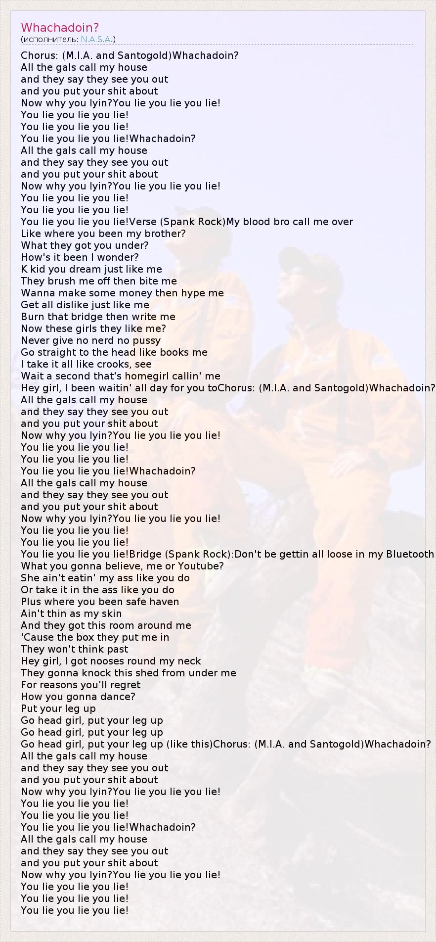 Chorus: (M.I.A. and Santogold)Whachadoin? All the gals call my house and they say they see you out and you put your shit about Now why you lyin?You lie you lie you lie! You lie you lie you lie! You lie you lie you lie! You lie you lie you lie!Whachadoin? All the gals call my house and they say they see you out and you put your shit about Now why you lyin?You lie you lie you lie! You lie you lie you lie! You lie you lie you lie! You lie you lie you lie!Verse (Spank Rock)My blood bro call me over Like where you been my brother? What they got you under? How's it been I wonder? K kid you dream just like me They brush me off then bite me Wanna make some money then hype me Get all dislike just like me Burn that bridge then write me Now these girls they like me? Never give no nerd no pussy Go straight to the head like books me I take it all like crooks, see Wait a second that's homegirl callin' me Hey girl, I been waitin' all day for you toChorus: (M.I.A. and Santogold)Whachadoin? All the gals call my house and they say they see you out and you put your shit about Now why you lyin?You lie you lie you lie! You lie you lie you lie! You lie you lie you lie! You lie you lie you lie!Whachadoin? All the gals call my house and they say they see you out and you put your shit about Now why you lyin?You lie you lie you lie! You lie you lie you lie! You lie you lie you lie! You lie you lie you lie!Bridge (Spank Rock):Don't be gettin all loose in my Bluetooth What you gonna believe, me or Youtube? She ain't eatin' my ass like you do Or take it in the ass like you do Plus where you been safe haven Ain't thin as my skin And they got this room around me 'Cause the box they put me in They won't think past Hey girl, I got nooses round my neck They gonna knock this shed from under me For reasons you'll regret How you gonna dance? Put your leg up Go head girl, put your leg up Go head girl, put your leg up Go head girl, put your leg up (like this)Chorus: (M.I.A. and Santogold)Whachadoin? All the gals call my house and they say they see you out and you put your shit about Now why you lyin?You lie you lie you lie! You lie you lie you lie! You lie you lie you lie! You lie you lie you lie!Whachadoin? All the gals call my house and they say they see you out and you put your shit about Now why you lyin?You lie you lie you lie! You lie you lie you lie! You lie you lie you lie! You lie you lie you lie!