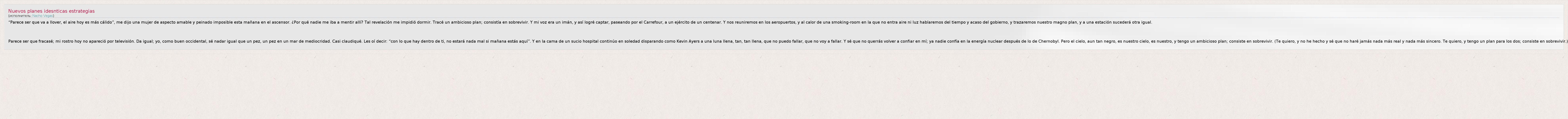 Parece ser que fracasé; mi rostro hoy no apareció por televisión. Da igual; yo, como buen occidental, sé nadar igual que un pez, un pez en un mar de mediocridad. Casi claudiqué. Les oí decir: “con lo que hay dentro de ti, no estará nada mal si mañana estás aquí”. Y en la cama de un sucio hospital continúo en soledad disparando como Kevin Ayers a una luna llena, tan, tan llena, que no puedo fallar, que no voy a fallar. Y sé que no querrás volver a confiar en mí; ya nadie confía en la energía nuclear después de lo de Chernobyl. Pero el cielo, aun tan negro, es nuestro cielo, es nuestro, y tengo un ambicioso plan; consiste en sobrevivir. (Te quiero, y no he hecho y sé que no haré jamás nada más real y nada más sincero. Te quiero, y tengo un plan para los dos; consiste en sobrevivir.)
