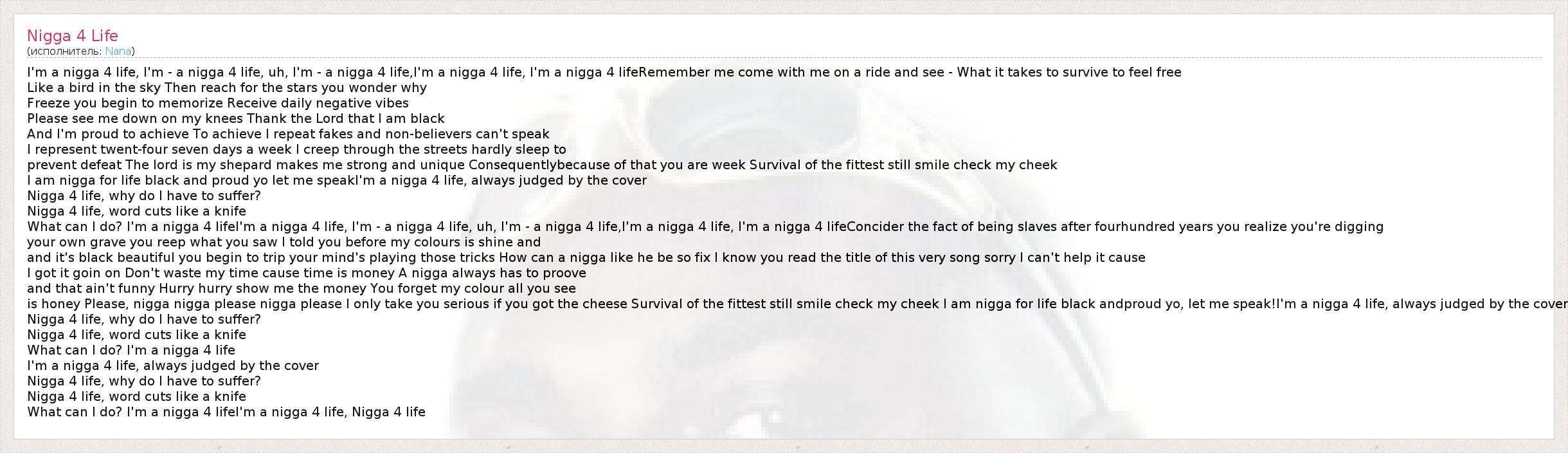 I'm a nigga 4 life, I'm - a nigga 4 life, uh, I'm - a nigga 4 life,I'm a nigga 4 life, I'm a nigga 4 lifeRemember me come with me on a ride and see - What it takes to survive to feel free Like a bird in the sky Then reach for the stars you wonder why Freeze you begin to memorize Receive daily negative vibes Please see me down on my knees Thank the Lord that I am black And I'm proud to achieve To achieve I repeat fakes and non-believers can't speak I represent twent-four seven days a week I creep through the streets hardly sleep to prevent defeat The lord is my shepard makes me strong and unique Consequentlybecause of that you are week Survival of the fittest still smile check my cheek I am nigga for life black and proud yo let me speakI'm a nigga 4 life, always judged by the cover Nigga 4 life, why do I have to suffer? Nigga 4 life, word cuts like a knife What can I do? I'm a nigga 4 lifeI'm a nigga 4 life, I'm - a nigga 4 life, uh, I'm - a nigga 4 life,I'm a nigga 4 life, I'm a nigga 4 lifeConcider the fact of being slaves after fourhundred years you realize you're digging your own grave you reep what you saw I told you before my colours is shine and and it's black beautiful you begin to trip your mind's playing those tricks How can a nigga like he be so fix I know you read the title of this very song sorry I can't help it cause I got it goin on Don't waste my time cause time is money A nigga always has to proove and that ain't funny Hurry hurry show me the money You forget my colour all you see is honey Please, nigga nigga please nigga please I only take you serious if you got the cheese Survival of the fittest still smile check my cheek I am nigga for life black andproud yo, let me speak!I'm a nigga 4 life, always judged by the cover Nigga 4 life, why do I have to suffer? Nigga 4 life, word cuts like a knife What can I do? I'm a nigga 4 life I'm a nigga 4 life, always judged by the cover Nigga 4 life, why do I have to suffer? Nigga 4 life, word cuts like a knife What can I do? I'm a nigga 4 lifeI'm a nigga 4 life, Nigga 4 life