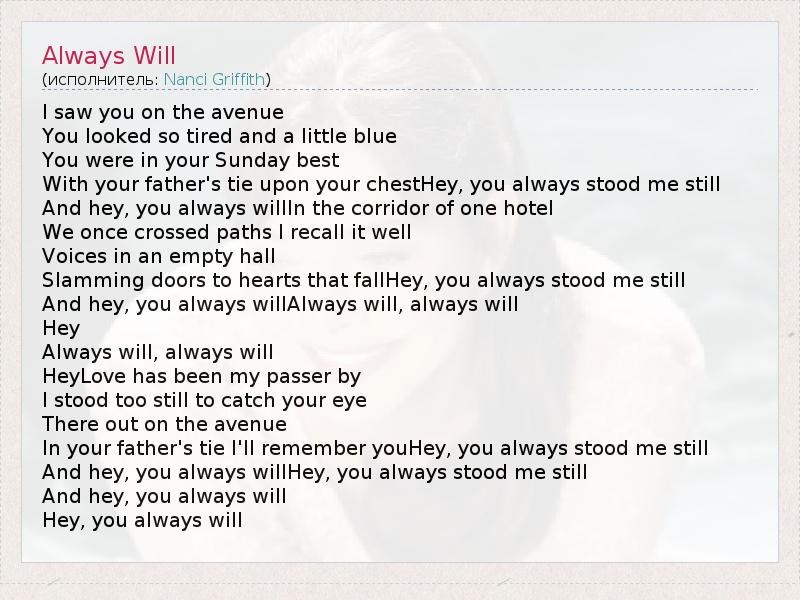 I saw you on the avenue You looked so tired and a little blue You were in your Sunday best With your father's tie upon your chestHey, you always stood me still And hey, you always willIn the corridor of one hotel We once crossed paths I recall it well Voices in an empty hall Slamming doors to hearts that fallHey, you always stood me still And hey, you always willAlways will, always will Hey Always will, always will HeyLove has been my passer by I stood too still to catch your eye There out on the avenue In your father's tie I'll remember youHey, you always stood me still And hey, you always willHey, you always stood me still And hey, you always will Hey, you always will