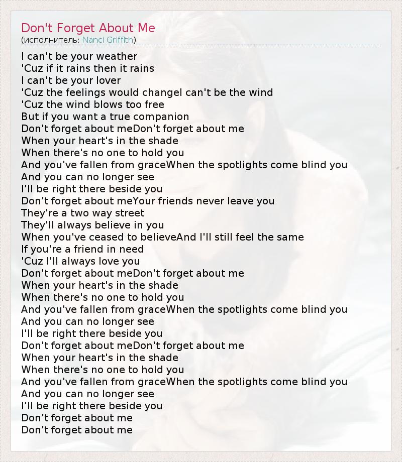 I can't be your weather 'Cuz if it rains then it rains I can't be your lover 'Cuz the feelings would changeI can't be the wind 'Cuz the wind blows too free But if you want a true companion Don't forget about meDon't forget about me When your heart's in the shade When there's no one to hold you And you've fallen from graceWhen the spotlights come blind you And you can no longer see I'll be right there beside you Don't forget about meYour friends never leave you They're a two way street They'll always believe in you When you've ceased to believeAnd I'll still feel the same If you're a friend in need 'Cuz I'll always love you Don't forget about meDon't forget about me When your heart's in the shade When there's no one to hold you And you've fallen from graceWhen the spotlights come blind you And you can no longer see I'll be right there beside you Don't forget about meDon't forget about me When your heart's in the shade When there's no one to hold you And you've fallen from graceWhen the spotlights come blind you And you can no longer see I'll be right there beside you Don't forget about me Don't forget about me