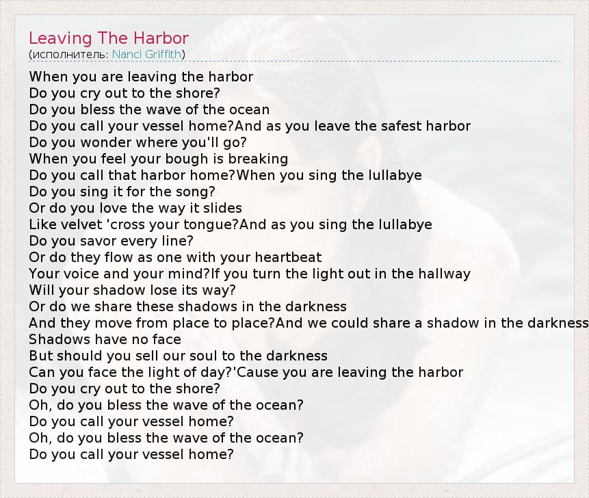 When you are leaving the harbor Do you cry out to the shore? Do you bless the wave of the ocean Do you call your vessel home?And as you leave the safest harbor Do you wonder where you'll go? When you feel your bough is breaking Do you call that harbor home?When you sing the lullabye Do you sing it for the song? Or do you love the way it slides Like velvet 'cross your tongue?And as you sing the lullabye Do you savor every line? Or do they flow as one with your heartbeat Your voice and your mind?If you turn the light out in the hallway Will your shadow lose its way? Or do we share these shadows in the darkness And they move from place to place?And we could share a shadow in the darkness Shadows have no face But should you sell our soul to the darkness Can you face the light of day?'Cause you are leaving the harbor Do you cry out to the shore? Oh, do you bless the wave of the ocean? Do you call your vessel home? Oh, do you bless the wave of the ocean? Do you call your vessel home?