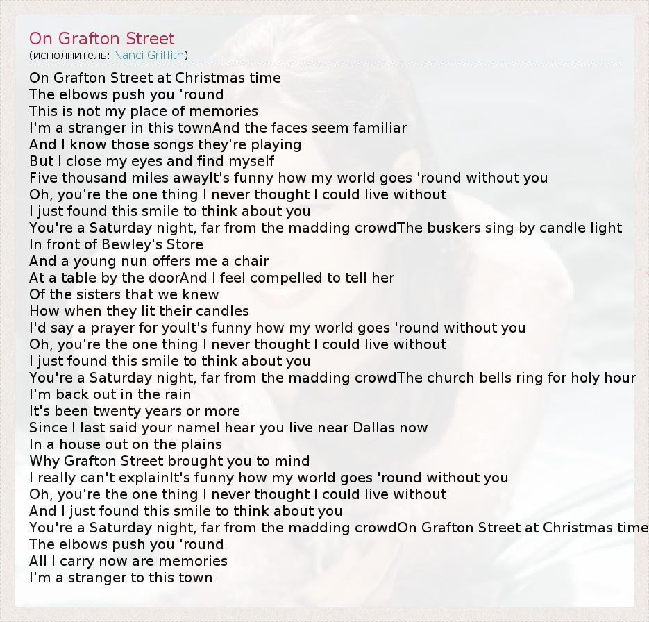 On Grafton Street at Christmas time The elbows push you 'round This is not my place of memories I'm a stranger in this townAnd the faces seem familiar And I know those songs they're playing But I close my eyes and find myself Five thousand miles awayIt's funny how my world goes 'round without you Oh, you're the one thing I never thought I could live without I just found this smile to think about you You're a Saturday night, far from the madding crowdThe buskers sing by candle light In front of Bewley's Store And a young nun offers me a chair At a table by the doorAnd I feel compelled to tell her Of the sisters that we knew How when they lit their candles I'd say a prayer for youIt's funny how my world goes 'round without you Oh, you're the one thing I never thought I could live without I just found this smile to think about you You're a Saturday night, far from the madding crowdThe church bells ring for holy hour I'm back out in the rain It's been twenty years or more Since I last said your nameI hear you live near Dallas now In a house out on the plains Why Grafton Street brought you to mind I really can't explainIt's funny how my world goes 'round without you Oh, you're the one thing I never thought I could live without And I just found this smile to think about you You're a Saturday night, far from the madding crowdOn Grafton Street at Christmas time The elbows push you 'round All I carry now are memories I'm a stranger to this town