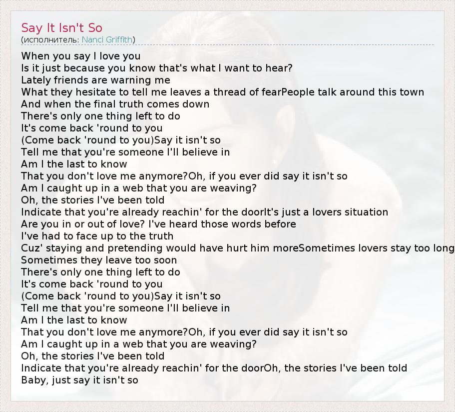 When you say I love you Is it just because you know that's what I want to hear? Lately friends are warning me What they hesitate to tell me leaves a thread of fearPeople talk around this town And when the final truth comes down There's only one thing left to do It's come back 'round to you (Come back 'round to you)Say it isn't so Tell me that you're someone I'll believe in Am I the last to know That you don't love me anymore?Oh, if you ever did say it isn't so Am I caught up in a web that you are weaving? Oh, the stories I've been told Indicate that you're already reachin' for the doorIt's just a lovers situation Are you in or out of love? I've heard those words before I've had to face up to the truth Cuz' staying and pretending would have hurt him moreSometimes lovers stay too long Sometimes they leave too soon There's only one thing left to do It's come back 'round to you (Come back 'round to you)Say it isn't so Tell me that you're someone I'll believe in Am I the last to know That you don't love me anymore?Oh, if you ever did say it isn't so Am I caught up in a web that you are weaving? Oh, the stories I've been told Indicate that you're already reachin' for the doorOh, the stories I've been told Baby, just say it isn't so