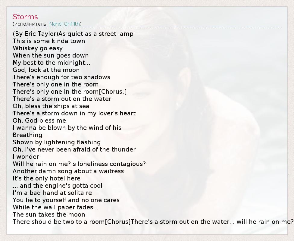 (By Eric Taylor)As quiet as a street lamp This is some kinda town Whiskey go easy When the sun goes down My best to the midnight... God, look at the moon There's enough for two shadows There's only one in the room There's only one in the room[Chorus:] There's a storm out on the water Oh, bless the ships at sea There's a storm down in my lover's heart Oh, God bless me I wanna be blown by the wind of his Breathing Shown by lightening flashing Oh, I've never been afraid of the thunder I wonder Will he rain on me?Is loneliness contagious? Another damn song about a waitress It's the only hotel here ... and the engine's gotta cool I'm a bad hand at solitaire You lie to yourself and no one cares While the wall paper fades... The sun takes the moon There should be two to a room[Chorus]There's a storm out on the water... will he rain on me?