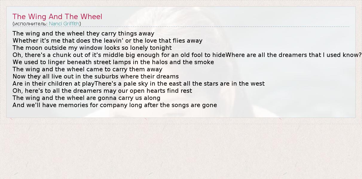 The wing and the wheel they carry things away Whether it's me that does the leavin' or the love that flies away The moon outside my window looks so lonely tonight Oh, there's a chunk out of it's middle big enough for an old fool to hideWhere are all the dreamers that I used know? We used to linger beneath street lamps in the halos and the smoke The wing and the wheel came to carry them away Now they all live out in the suburbs where their dreams Are in their children at playThere's a pale sky in the east all the stars are in the west Oh, here's to all the dreamers may our open hearts find rest The wing and the wheel are gonna carry us along And we'll have memories for company long after the songs are gone