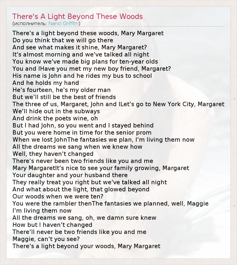 There's a light beyond these woods, Mary Margaret Do you think that we will go there And see what makes it shine, Mary Margaret? It's almost morning and we've talked all night You know we've made big plans for ten-year olds You and IHave you met my new boy friend, Margaret? His name is John and he rides my bus to school And he holds my hand He's fourteen, he's my older man But we'll still be the best of friends The three of us, Margaret, John and ILet's go to New York City, Margaret We'll hide out in the subways And drink the poets wine, oh But I had John, so you went and I stayed behind But you were home in time for the senior prom When we lost JohnThe fantasies we plan, I'm living them now All the dreams we sang when we knew how Well, they haven't changed There's never been two friends like you and me Mary MargaretIt's nice to see your family growing, Margaret Your daughter and your husband there They really treat you right but we've talked all night And what about the light, that glowed beyond Our woods when we were ten? You were the rambler thenThe fantasies we planned, well, Maggie I'm living them now All the dreams we sang, oh, we damn sure knew How but I haven't changed There'll never be two friends like you and me Maggie, can't you see? There's a light beyond your woods, Mary Margaret