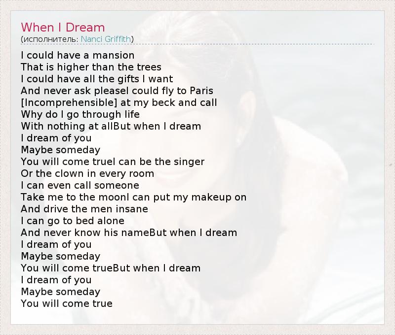 I could have a mansion That is higher than the trees I could have all the gifts I want And never ask pleaseI could fly to Paris [Incomprehensible] at my beck and call Why do I go through life With nothing at allBut when I dream I dream of you Maybe someday You will come trueI can be the singer Or the clown in every room I can even call someone Take me to the moonI can put my makeup on And drive the men insane I can go to bed alone And never know his nameBut when I dream I dream of you Maybe someday You will come trueBut when I dream I dream of you Maybe someday You will come true