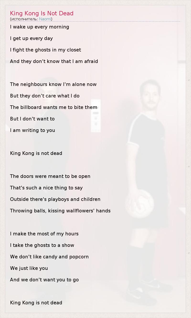 I wake up every morning I get up every day I fight the ghosts in my closet And they don't know that I am afraid The neighbours know I'm alone now But they don't care what I do The billboard wants me to bite them But I don't want to I am writing to you King Kong is not dead The doors were meant to be open That's such a nice thing to say Outside there's playboys and children Throwing balls, kissing wallflowers' hands I make the most of my hours I take the ghosts to a show We don't like candy and popcorn We just like you And we don't want you to go King Kong is not dead