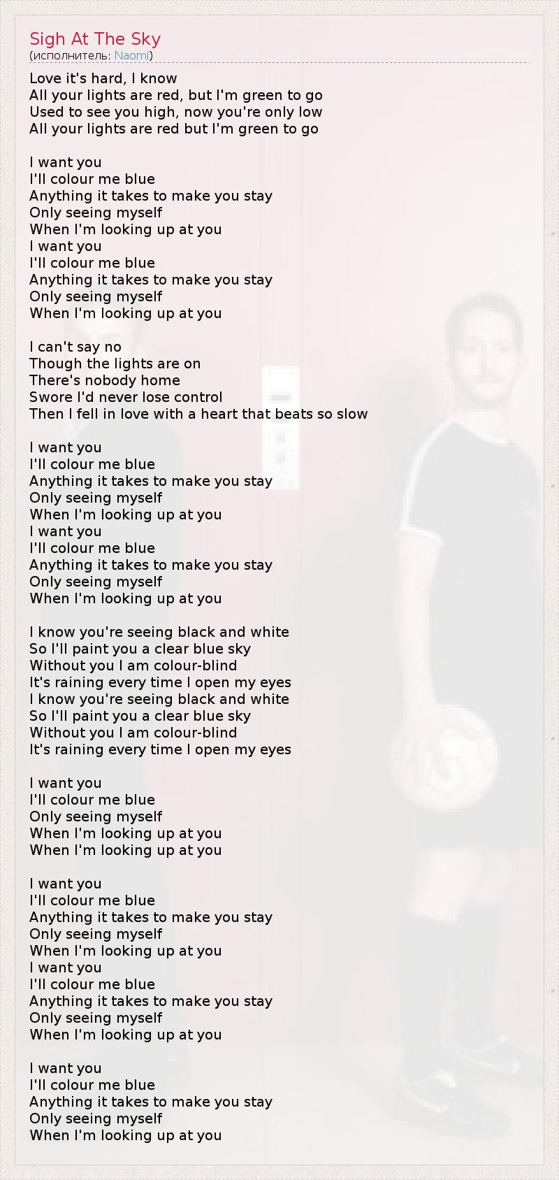 Love it's hard, I know All your lights are red, but I'm green to go Used to see you high, now you're only low All your lights are red but I'm green to go I want you I'll colour me blue Anything it takes to make you stay Only seeing myself When I'm looking up at you I want you I'll colour me blue Anything it takes to make you stay Only seeing myself When I'm looking up at you I can't say no Though the lights are on There's nobody home Swore I'd never lose control Then I fell in love with a heart that beats so slow I want you I'll colour me blue Anything it takes to make you stay Only seeing myself When I'm looking up at you I want you I'll colour me blue Anything it takes to make you stay Only seeing myself When I'm looking up at you I know you're seeing black and white So I'll paint you a clear blue sky Without you I am colour-blind It's raining every time I open my eyes I know you're seeing black and white So I'll paint you a clear blue sky Without you I am colour-blind It's raining every time I open my eyes I want you I'll colour me blue Only seeing myself When I'm looking up at you When I'm looking up at you I want you I'll colour me blue Anything it takes to make you stay Only seeing myself When I'm looking up at you I want you I'll colour me blue Anything it takes to make you stay Only seeing myself When I'm looking up at you I want you I'll colour me blue Anything it takes to make you stay Only seeing myself When I'm looking up at you