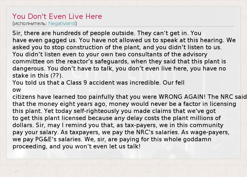 Sir, there are hundreds of people outside. They can't get in. You have even gagged us. You have not allowed us to speak at this hearing. We asked you to stop construction of the plant, and you didn't listen to us. You didn't listen even to your own two consultants of the advisory committee on the reactor's safeguards, when they said that this plant is dangerous. You don't have to talk, you don't even live here, you have no stake in this (??). You told us that a Class 9 accident was incredible. Our fell ow citizens have learned too painfully that you were WRONG AGAIN! The NRC said that the money eight years ago, money would never be a factor in licensing this plant. Yet today self-righteously you made claims that we've got to get this plant licensed because any delay costs the plant millions of dollars. Sir, may I remind you that, as tax-payers, we in this community pay your salary. As taxpayers, we pay the NRC's salaries. As wage-payers, we pay PG&E's salaries. We, sir, are paying for this whole goddamn proceeding, and you won't even let us talk!