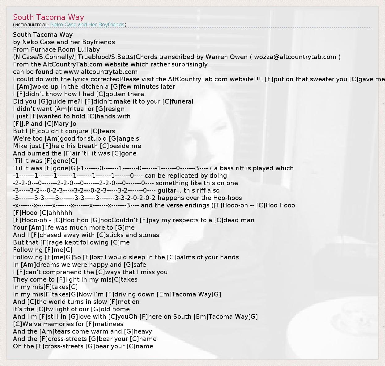 South Tacoma Way by Neko Case and her Boyfriends From Furnace Room Lullaby (N.Case/B.Connelly/J.Trueblood/S.Betts)Chords transcribed by Warren Owen ( wozza@altcountrytab.com ) From the AltCountryTab.com website which rather surprisingly can be found at www.altcountrytab.com I could do with the lyrics correctedPlease visit the AltCountryTab.com website!!!I [F]put on that sweater you [C]gave me I [Am]woke up in the kitchen a [G]few minutes later I [F]didn't know how I had [C]gotten there Did you [G]guide me?I [F]didn't make it to your [C]funeral I didn't want [Am]ritual or [G]resign I just [F]wanted to hold [C]hands with [F]J.P and [C]Mary-Jo But I [F]couldn't conjure [C]tears We're too [Am]good for stupid [G]angels Mike just [F]held his breath [C]beside me And burned the [F]air 'til it was [C]gone 'Til it was [F]gone[C] 'Til it was [F]gone[G]-1-------0-------1-------0-------1-------0-------3---- ( a bass riff is played which -1-------1-------1-------1-------1-------1-------0---- can be replicated by doing -2-2-0---0-------2-2-0---0-------2-2-0---0-------0---- something like this on one -3-----3-2---0-2-3-----3-2---0-2-3-----3-2-------0---- guitar... this riff also -3-------3-3-----3-------3-3-----3-------3-3-2-0-2-0-2 happens over the Hoo-hoos -x-------x-------x-------x-------x-------x-------3---- and the verse endings )[F]Hooo-oh -- [C]Hoo Hooo [F]Hooo [C]ahhhhh [F]Hooo-oh - [C]Hoo Hoo [G]hooCouldn't [F]pay my respects to a [C]dead man Your [Am]life was much more to [G]me And I [F]chased away with [C]sticks and stones But that [F]rage kept following [C]me Following [F]me[C] Following [F]me[G]So [F]lost I would sleep in the [C]palms of your hands In [Am]dreams we were happy and [G]safe I [F]can't comprehend the [C]ways that I miss you They come to [F]light in my mis[C]takes In my mis[F]takes[C] In my mis[F]takes[G]Now I'm [F]driving down [Em]Tacoma Way[G] And [C]the world turns in slow [F]motion It's the [C]twilight of our [G]old home And I'm [F]still in [G]love with [C]youOh [F]here on South [Em]Tacoma Way[G] [C]We've memories for [F]matinees And the [Am]tears come warm and [G]heavy And the [F]cross-streets [G]bear your [C]name Oh the [F]cross-streets [G]bear your [C]name