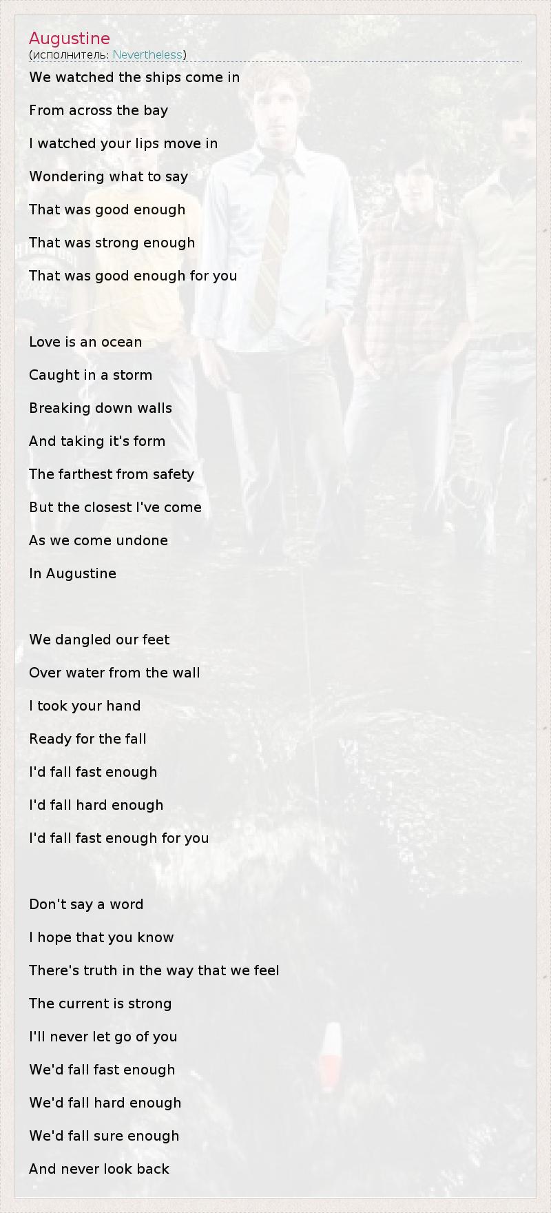 Это интересно:Nevertheless (сокращенно NTL) - christian группа из Тенесси. Название было взято из Евангелия от Луки: "Симон сказал Ему в ответ: Наставник! мы трудились всю ночь и ничего не поймали, но по слову Твоему (Nevertheless) закину сеть." Песни "Live Like We're Alive", "The Real" и "Cross... продолжение