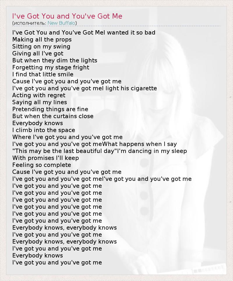I've Got You and You've Got MeI wanted it so bad Making all the props Sitting on my swing Giving all I've got But when they dim the lights Forgetting my stage fright I find that little smile Cause I've got you and you've got me I've got you and you've got meI light his cigarette Acting with regret Saying all my lines Pretending things are fine But when the curtains close Everybody knows I climb into the space Where I've got you and you've got me I've got you and you've got meWhat happens when I say "This may be the last beautiful day"I'm dancing in my sleep With promises I'll keep Feeling so complete Cause I've got you and you've got me I've got you and you've got meI've got you and you've got me I've got you and you've got me I've got you and you've got me I've got you and you've got me I've got you and you've got me I've got you and you've got me I've got you and you've got me Everybody knows, everybody knows I've got you and you've got me Everybody knows, everybody knows I've got you and you've got me Everybody knows I've got you and you've got me
