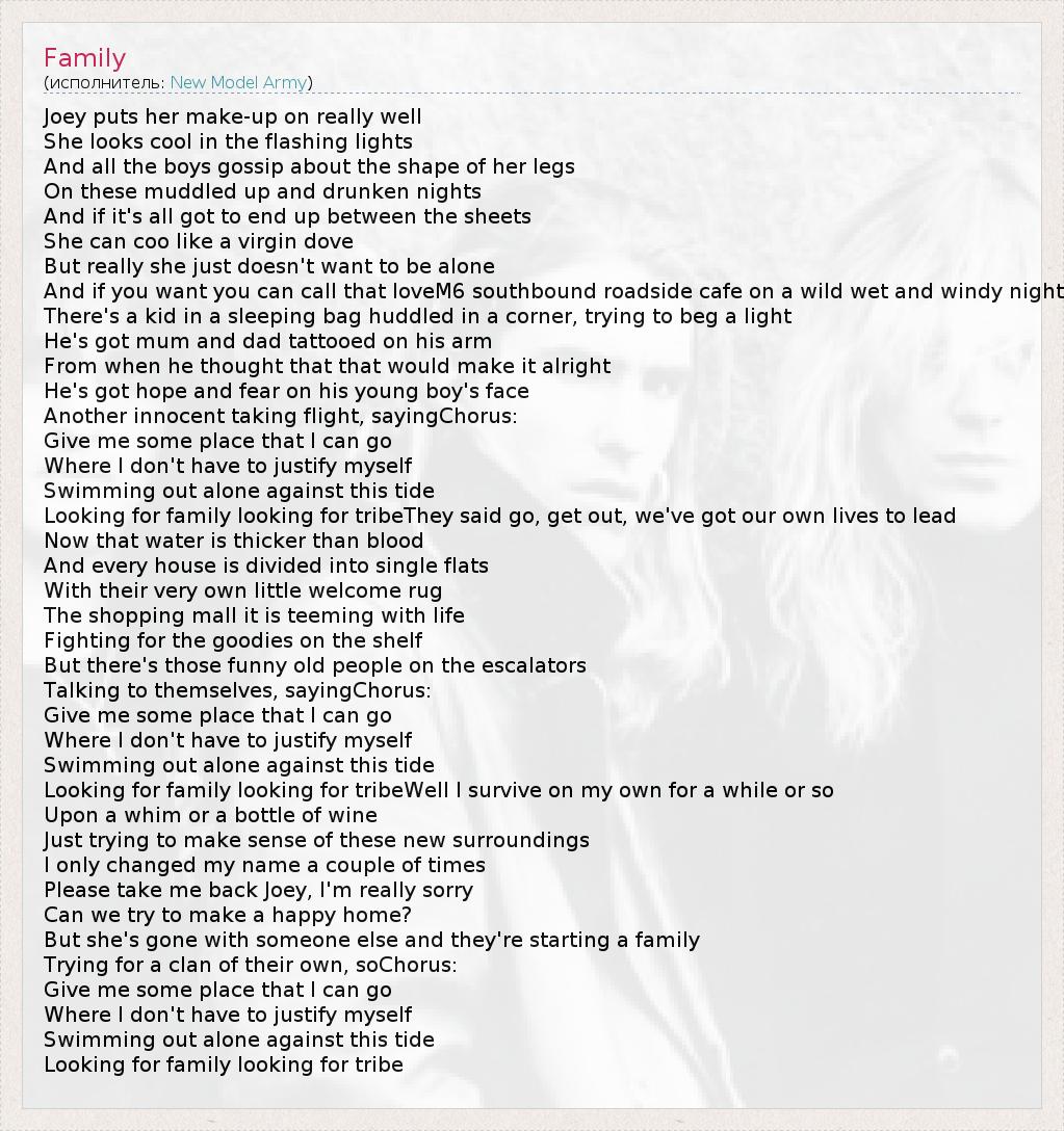 Joey puts her make-up on really well She looks cool in the flashing lights And all the boys gossip about the shape of her legs On these muddled up and drunken nights And if it's all got to end up between the sheets She can coo like a virgin dove But really she just doesn't want to be alone And if you want you can call that loveM6 southbound roadside cafe on a wild wet and windy night There's a kid in a sleeping bag huddled in a corner, trying to beg a light He's got mum and dad tattooed on his arm From when he thought that that would make it alright He's got hope and fear on his young boy's face Another innocent taking flight, sayingChorus: Give me some place that I can go Where I don't have to justify myself Swimming out alone against this tide Looking for family looking for tribeThey said go, get out, we've got our own lives to lead Now that water is thicker than blood And every house is divided into single flats With their very own little welcome rug The shopping mall it is teeming with life Fighting for the goodies on the shelf But there's those funny old people on the escalators Talking to themselves, sayingChorus: Give me some place that I can go Where I don't have to justify myself Swimming out alone against this tide Looking for family looking for tribeWell I survive on my own for a while or so Upon a whim or a bottle of wine Just trying to make sense of these new surroundings I only changed my name a couple of times Please take me back Joey, I'm really sorry Can we try to make a happy home? But she's gone with someone else and they're starting a family Trying for a clan of their own, soChorus: Give me some place that I can go Where I don't have to justify myself Swimming out alone against this tide Looking for family looking for tribe