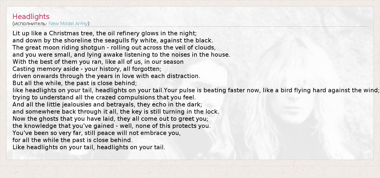like headlights on your tail, headlights on your tail.Your pulse is beating faster now, like a bird flying hard against the wind;