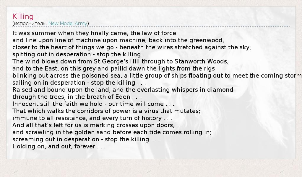 It was summer when they finally came, the law of force and line upon line of machine upon machine, back into the greenwood, closer to the heart of things we go - beneath the wires stretched against the sky, spitting out in desperation - stop the killing . . . The wind blows down from St George's Hill through to Stanworth Woods, and to the East, on this grey and pallid dawn the lights from the rigs blinking out across the poisoned sea, a little group of ships floating out to meet the coming storm sailing on in desperation - stop the killing . . . Raised and bound upon the land, and the everlasting whispers in diamond through the trees, in the breath of Eden . . . Innocent still the faith we hold - our time will come . . . That which walks the corridors of power is a virus that mutates; immune to all resistance, and every turn of history . . . And all that's left for us is marking crosses upon doors, and scrawling in the golden sand before each tide comes rolling in; screaming out in desperation - stop the killing . . . Holding on, and out, forever . . .