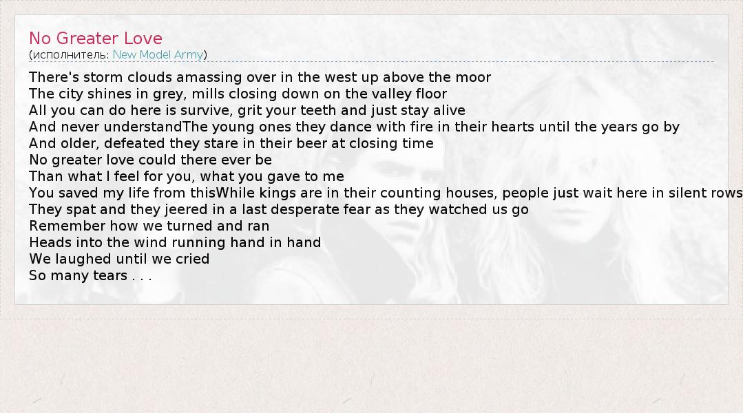 А как ты думаешь, о чем песня "No Greater Love" ?