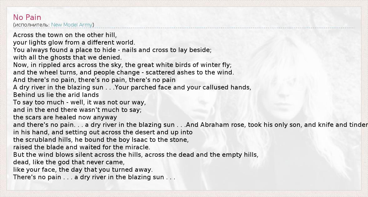 Across the town on the other hill, your lights glow from a different world. You always found a place to hide - nails and cross to lay beside; with all the ghosts that we denied. Now, in rippled arcs across the sky, the great white birds of winter fly; and the wheel turns, and people change - scattered ashes to the wind. And there's no pain, there's no pain, there's no pain A dry river in the blazing sun . . .Your parched face and your callused hands, Behind us lie the arid lands To say too much - well, it was not our way, and in the end there wasn't much to say; the scars are healed now anyway and there's no pain. . . a dry river in the blazing sun . . .And Abraham rose, took his only son, and knife and tinder in his hand, and setting out across the desert and up into the scrubland hills, he bound the boy Isaac to the stone, raised the blade and waited for the miracle. But the wind blows silent across the hills, across the dead and the empty hills, dead, like the god that never came, like your face, the day that you turned away. There's no pain . . . a dry river in the blazing sun . . .