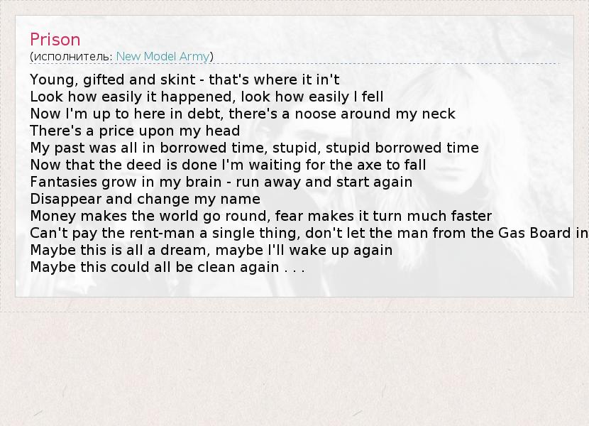 Это интересно:1980—1989New Model Army (заимствовавшие название у военной организации под предводительством Оливера Кромвеля) образовались в Брэдфорде, графство Йоркшир, в 1980 году под предводительством поющего гитариста Слэйда-Уравнителя (Slade The Leveller, он же Джастин Салливан, родился 8 апреля 1956 года в Букингемшире, Англия). Соавтором идеи можно считать его подругу, писательницу и поэтессу Джулз Денби (Joolz... продолжение
