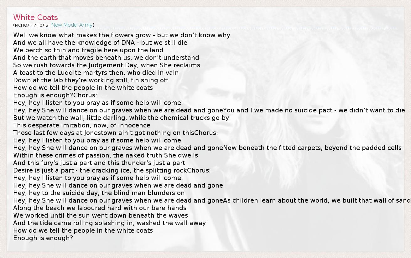 Well we know what makes the flowers grow - but we don't know why And we all have the knowledge of DNA - but we still die We perch so thin and fragile here upon the land And the earth that moves beneath us, we don't understand So we rush towards the Judgement Day, when She reclaims A toast to the Luddite martyrs then, who died in vain Down at the lab they're working still, finishing off How do we tell the people in the white coats Enough is enough?Chorus: Hey, hey I listen to you pray as if some help will come Hey, hey She will dance on our graves when we are dead and goneYou and I we made no suicide pact - we didn't want to die But we watch the wall, little darling, while the chemical trucks go by This desperate imitation, now, of innocence Those last few days at Jonestown ain't got nothing on thisChorus: Hey, hey I listen to you pray as if some help will come Hey, hey She will dance on our graves when we are dead and goneNow beneath the fitted carpets, beyond the padded cells Within these crimes of passion, the naked truth She dwells And this fury's just a part and this thunder's just a part Desire is just a part - the cracking ice, the splitting rockChorus: Hey, hey I listen to you pray as if some help will come Hey, hey She will dance on our graves when we are dead and gone Hey, hey to the suicide day, the blind man blunders on Hey, hey She will dance on our graves when we are dead and goneAs children learn about the world, we built that wall of sand Along the beach we laboured hard with our bare hands We worked until the sun went down beneath the waves And the tide came rolling splashing in, washed the wall away How do we tell the people in the white coats Enough is enough?