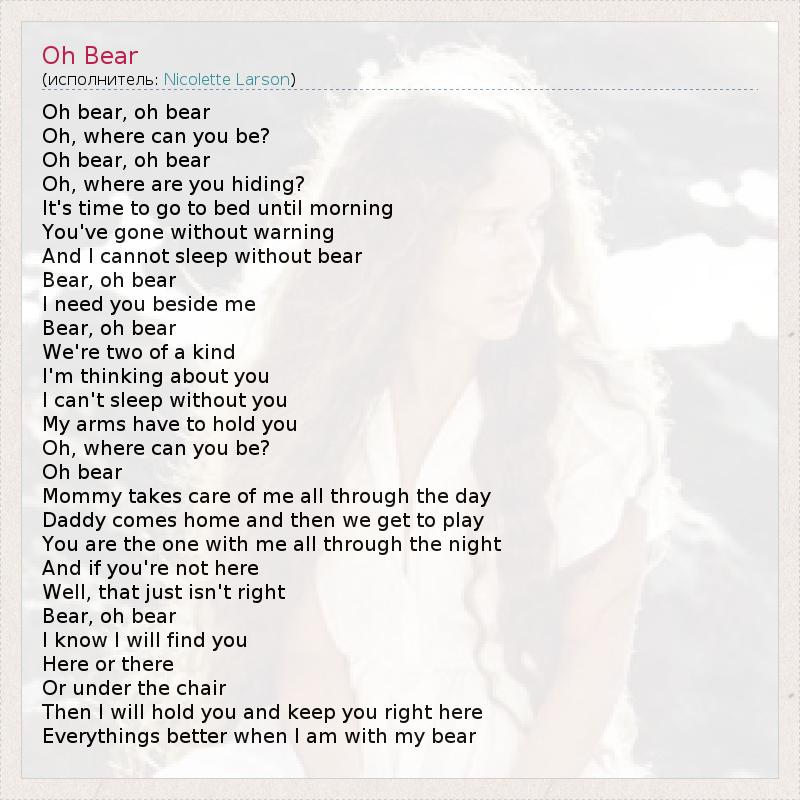 Oh bear, oh bear Oh, where can you be? Oh bear, oh bear Oh, where are you hiding? It's time to go to bed until morning You've gone without warning And I cannot sleep without bear Bear, oh bear I need you beside me Bear, oh bear We're two of a kind I'm thinking about you I can't sleep without you My arms have to hold you Oh, where can you be? Oh bear Mommy takes care of me all through the day Daddy comes home and then we get to play You are the one with me all through the night And if you're not here Well, that just isn't right Bear, oh bear I know I will find you Here or there Or under the chair Then I will hold you and keep you right here Everythings better when I am with my bear