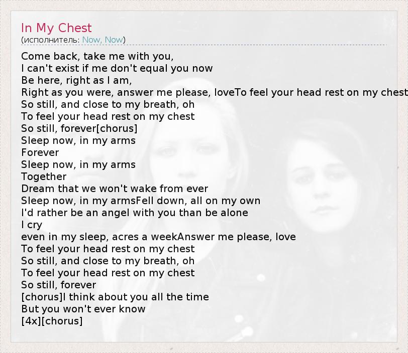 Come back, take me with you, I can't exist if me don't equal you now Be here, right as I am, Right as you were, answer me please, loveTo feel your head rest on my chest So still, and close to my breath, oh To feel your head rest on my chest So still, forever[chorus] Sleep now, in my arms Forever Sleep now, in my arms Together Dream that we won't wake from ever Sleep now, in my armsFell down, all on my own I'd rather be an angel with you than be alone I cry even in my sleep, acres a weekAnswer me please, love To feel your head rest on my chest So still, and close to my breath, oh To feel your head rest on my chest So still, forever [chorus]I think about you all the time But you won't ever know [4x][chorus]