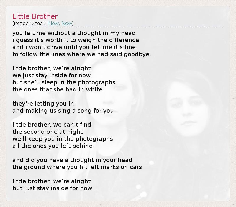 you left me without a thought in my head i guess it's worth it to weigh the difference and i won't drive until you tell me it's fine to follow the lines where we had said goodbye little brother, we're alright we just stay inside for now but she'll sleep in the photographs the ones that she had in white they're letting you in and making us sing a song for you little brother, we can't find the second one at night we'll keep you in the photographs all the ones you left behind and did you have a thought in your head the ground where you hit left marks on cars little brother, we're alright but just stay inside for now