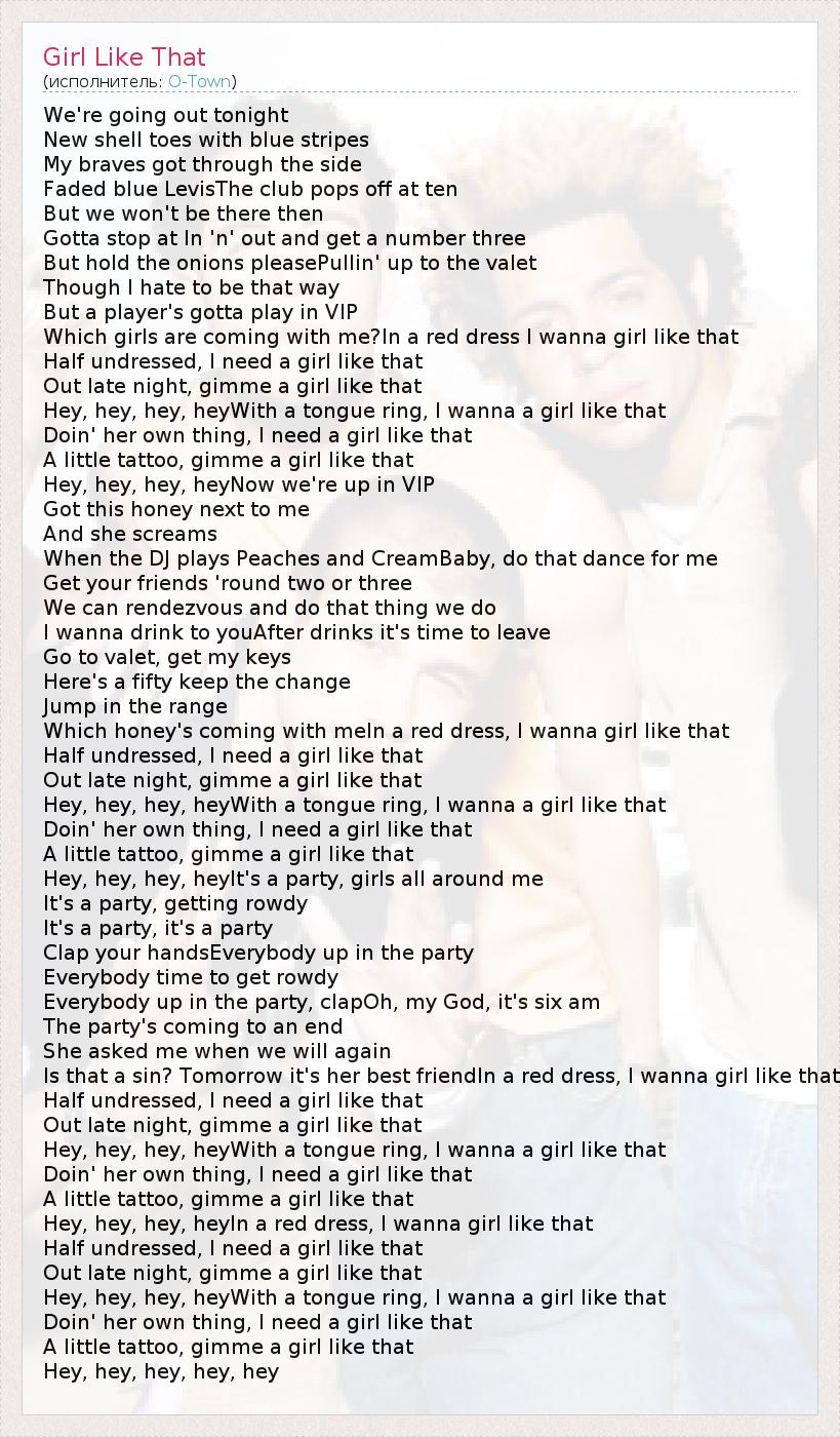 We're going out tonight New shell toes with blue stripes My braves got through the side Faded blue LevisThe club pops off at ten But we won't be there then Gotta stop at In 'n' out and get a number three But hold the onions pleasePullin' up to the valet Though I hate to be that way But a player's gotta play in VIP Which girls are coming with me?In a red dress I wanna girl like that Half undressed, I need a girl like that Out late night, gimme a girl like that Hey, hey, hey, heyWith a tongue ring, I wanna a girl like that Doin' her own thing, I need a girl like that A little tattoo, gimme a girl like that Hey, hey, hey, heyNow we're up in VIP Got this honey next to me And she screams When the DJ plays Peaches and CreamBaby, do that dance for me Get your friends 'round two or three We can rendezvous and do that thing we do I wanna drink to youAfter drinks it's time to leave Go to valet, get my keys Here's a fifty keep the change Jump in the range Which honey's coming with meIn a red dress, I wanna girl like that Half undressed, I need a girl like that Out late night, gimme a girl like that Hey, hey, hey, heyWith a tongue ring, I wanna a girl like that Doin' her own thing, I need a girl like that A little tattoo, gimme a girl like that Hey, hey, hey, heyIt's a party, girls all around me It's a party, getting rowdy It's a party, it's a party Clap your handsEverybody up in the party Everybody time to get rowdy Everybody up in the party, clapOh, my God, it's six am The party's coming to an end She asked me when we will again Is that a sin? Tomorrow it's her best friendIn a red dress, I wanna girl like that Half undressed, I need a girl like that Out late night, gimme a girl like that Hey, hey, hey, heyWith a tongue ring, I wanna a girl like that Doin' her own thing, I need a girl like that A little tattoo, gimme a girl like that Hey, hey, hey, heyIn a red dress, I wanna girl like that Half undressed, I need a girl like that Out late night, gimme a girl like that Hey, hey, hey, heyWith a tongue ring, I wanna a girl like that Doin' her own thing, I need a girl like that A little tattoo, gimme a girl like that Hey, hey, hey, hey, hey