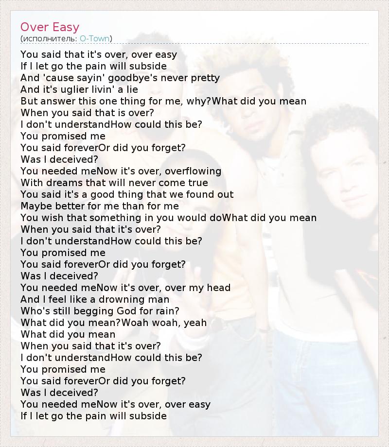 You said that it's over, over easy If I let go the pain will subside And 'cause sayin' goodbye's never pretty And it's uglier livin' a lie But answer this one thing for me, why?What did you mean When you said that is over? I don't understandHow could this be? You promised me You said foreverOr did you forget? Was I deceived? You needed meNow it's over, overflowing With dreams that will never come true You said it's a good thing that we found out Maybe better for me than for me You wish that something in you would doWhat did you mean When you said that it's over? I don't understandHow could this be? You promised me You said foreverOr did you forget? Was I deceived? You needed meNow it's over, over my head And I feel like a drowning man Who's still begging God for rain? What did you mean?Woah woah, yeah What did you mean When you said that it's over? I don't understandHow could this be? You promised me You said foreverOr did you forget? Was I deceived? You needed meNow it's over, over easy If I let go the pain will subside