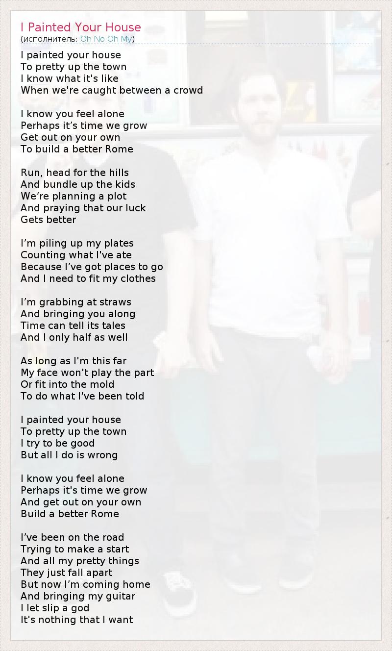 I painted your house To pretty up the town I know what it's like When we're caught between a crowd I know you feel alone Perhaps it’s time we grow Get out on your own To build a better Rome Run, head for the hills And bundle up the kids We’re planning a plot And praying that our luck Gets better I’m piling up my plates Counting what I've ate Because I’ve got places to go And I need to fit my clothes I’m grabbing at straws And bringing you along Time can tell its tales And I only half as well As long as I'm this far My face won't play the part Or fit into the mold To do what I've been told I painted your house To pretty up the town I try to be good But all I do is wrong I know you feel alone Perhaps it's time we grow And get out on your own Build a better Rome I’ve been on the road Trying to make a start And all my pretty things They just fall apart But now I’m coming home And bringing my guitar I let slip a god It's nothing that I want