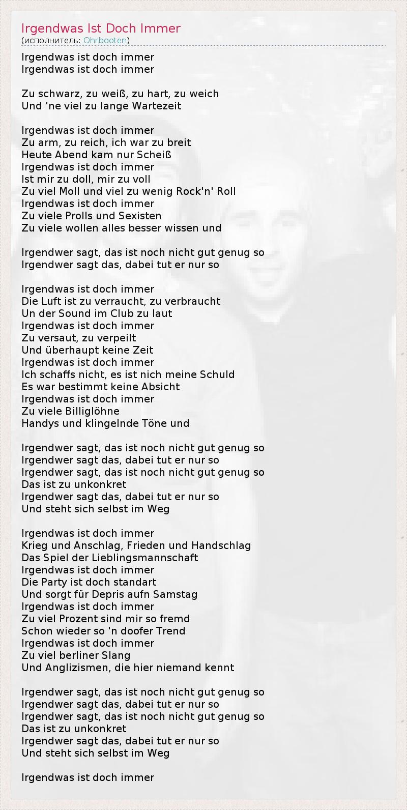 Irgendwas ist doch immer Irgendwas ist doch immer Zu schwarz, zu weiß, zu hart, zu weich Und 'ne viel zu lange Wartezeit Irgendwas ist doch immer Zu arm, zu reich, ich war zu breit Heute Abend kam nur Scheiß Irgendwas ist doch immer Ist mir zu doll, mir zu voll Zu viel Moll und viel zu wenig Rock'n' Roll Irgendwas ist doch immer Zu viele Prolls und Sexisten Zu viele wollen alles besser wissen und Irgendwer sagt, das ist noch nicht gut genug so Irgendwer sagt das, dabei tut er nur so Irgendwas ist doch immer Die Luft ist zu verraucht, zu verbraucht Un der Sound im Club zu laut Irgendwas ist doch immer Zu versaut, zu verpeilt Und überhaupt keine Zeit Irgendwas ist doch immer Ich schaffs nicht, es ist nich meine Schuld Es war bestimmt keine Absicht Irgendwas ist doch immer Zu viele Billiglöhne Handys und klingelnde Töne und Irgendwer sagt, das ist noch nicht gut genug so Irgendwer sagt das, dabei tut er nur so Irgendwer sagt, das ist noch nicht gut genug so Das ist zu unkonkret Irgendwer sagt das, dabei tut er nur so Und steht sich selbst im Weg Irgendwas ist doch immer Krieg und Anschlag, Frieden und Handschlag Das Spiel der Lieblingsmannschaft Irgendwas ist doch immer Die Party ist doch standart Und sorgt für Depris aufn Samstag Irgendwas ist doch immer Zu viel Prozent sind mir so fremd Schon wieder so 'n doofer Trend Irgendwas ist doch immer Zu viel berliner Slang Und Anglizismen, die hier niemand kennt Irgendwer sagt, das ist noch nicht gut genug so Irgendwer sagt das, dabei tut er nur so Irgendwer sagt, das ist noch nicht gut genug so Das ist zu unkonkret Irgendwer sagt das, dabei tut er nur so Und steht sich selbst im Weg Irgendwas ist doch immer
