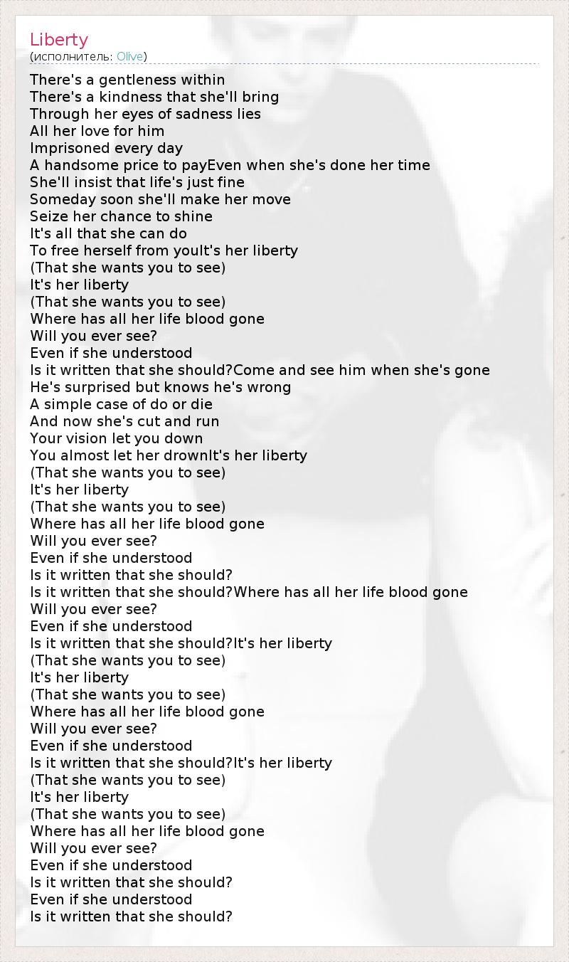 There's a gentleness within There's a kindness that she'll bring Through her eyes of sadness lies All her love for him Imprisoned every day A handsome price to payEven when she's done her time She'll insist that life's just fine Someday soon she'll make her move Seize her chance to shine It's all that she can do To free herself from youIt's her liberty (That she wants you to see) It's her liberty (That she wants you to see) Where has all her life blood gone Will you ever see? Even if she understood Is it written that she should?Come and see him when she's gone He's surprised but knows he's wrong A simple case of do or die And now she's cut and run Your vision let you down You almost let her drownIt's her liberty (That she wants you to see) It's her liberty (That she wants you to see) Where has all her life blood gone Will you ever see? Even if she understood Is it written that she should? Is it written that she should?Where has all her life blood gone Will you ever see? Even if she understood Is it written that she should?It's her liberty (That she wants you to see) It's her liberty (That she wants you to see) Where has all her life blood gone Will you ever see? Even if she understood Is it written that she should?It's her liberty (That she wants you to see) It's her liberty (That she wants you to see) Where has all her life blood gone Will you ever see? Even if she understood Is it written that she should? Even if she understood Is it written that she should?