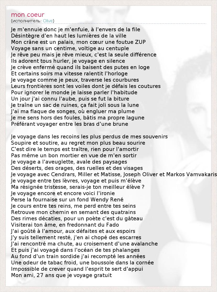 Je m'ennuie donc je m'enfuie, à l'envers de la file Désintègre d'en haut les lumières de la ville Mon crâne est un palais, mon cœur une foutue ZUP Voyage sans un centime, voltige au centuple Je rêve peu mais je rêve mieux, c'est la seule différence Ils adorent tous hurler, je voyage en silence Je crève enfermé quand ils baisent des putes en loge Et certains soirs ma vitesse ralentit l'horloge Je voyage comme je peux, traverse les courbures Leurs frontières sont les voiles dont je défais les coutures Pour ignorer le monde je laisse parler l'habitude Un jour j'ai connu l'aube, puis se fut la biture Je traîne un sac de ruines, ça fait joli sous la lune J'ai ma flaque de songes, où engluer ma plume Je me sens hors des foules, bâtis ma propre lagune Préférant voyager entre les bras d'une brune Je voyage dans les recoins les plus perdus de mes souvenirs Soupire et soutire, au regret mon plus beau sourire C'est dire le temps est traître, rien pour l'amortir Pas même un bon mortier en vue de m'en sortir Je voyage a l'aveuglette, avale des paysages Des déserts, des orages, des ruelles et des visages Je voyage avec Cendrars, Miller et Matisse, Joseph Oliver et Markos Vamvakaris Je voyage entre tes lèvres, voyage et puis m'élève Ma résignée tristesse, serais-je ton meilleur élève ? Je voyage encore et encore voici l'ironie Perse la fournaise sur un fond Wendy René Je cours entre tes reins, me perd entre tes seins Retrouve mon chemin en semant des quatrains Des rimes décaties, pour un poète c'est du gâteau Visiterai ton âme, en fredonnant du Fado J'ai goûté à l'amour, aux défaites et aux espoirs J'y suis tellement resté, j'en ai chopé des escarres J'ai rencontré ma chute, au croisement d'une avalanche Et puis j'ai voyagé dans l'océan de tes phalanges Au fond d'un train sordide j'ai recompté les années Une odeur de tabac froid, une boussole dans la cornée Impossible de crever quand l'esprit te sert d'appui Mon ami, 27 ans que je voyage gratuit