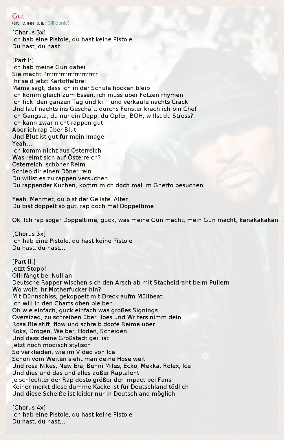 [Chorus 3x] Ich hab eine Pistole, du hast keine Pistole Du hast, du hast… [Part I:] Ich hab meine Gun dabei Sie macht Prrrrrrrrrrrrrrrrrrrrrr Ihr seid jetzt Kartoffelbrei Mama sagt, dass ich in der Schule hocken bleib Ich komm gleich zum Essen, ich muss über Fotzen rhymen Ich fick’ den ganzen Tag und kiff’ und verkaufe nachts Crack Und lauf nachts ins Geschäft, durchs Fenster krach ich bin Chef Ich Gangsta, du nur ein Depp, du Opfer, BOH, willst du Stress? Ich kann zwar nicht rappen gut Aber ich rap über Blut Und Blut ist gut für mein Image Yeah… Ich komm nicht aus Österreich Was reimt sich auf Österreich? Österreich, schöner Reim Schieb dir einen Döner rein Du willst es zu rappen versuchen Du rappender Kuchen, komm mich doch mal im Ghetto besuchen Yeah, Mehmet, du bist der Geilste, Alter Du bist doppelt so gut, rap doch mal Doppeltime Ok, Ich rap sogar Doppeltime, guck, was meine Gun macht, mein Gun macht, kanakakakan… [Chorus 3x] Ich hab eine Pistole, du hast keine Pistole Du hast, du hast… [Part II:] Jetzt Stopp! Olli fängt bei Null an Deutsche Rapper wischen sich den Arsch ab mit Stacheldraht beim Pullern Wo wollt ihr Motherfucker hin? Mit Dünnschiss, gekoppelt mit Dreck aufm Müllbeat Ich will in den Charts oben bleiben Oh wie einfach, guck einfach was großes Signings Oversized, zu schreiben über Hoes und Writers nimm dein Rosa Bleistift, flow und schreib doofe Reime über Koks, Drogen, Weiber, Hoden, Scheiden Und dass deine Großstadt geil ist Jetzt noch modisch stylisch So verkleiden, wie im Video von Ice Schon vom Weiten sieht man deine Hose weit Und rosa Nikes, New Era, Benni Miles, Ecko, Mekka, Rolex, Ice Und dies und das und alles außer Raptalent Je schlechter der Rap desto größer der Impact bei Fans Keiner merkt diese dumme Kacke ist für Deutschland tödlich Und diese Scheiße ist leider nur in Deutschland möglich [Chorus 4x] Ich hab eine Pistole, du hast keine Pistole Du hast, du hast…