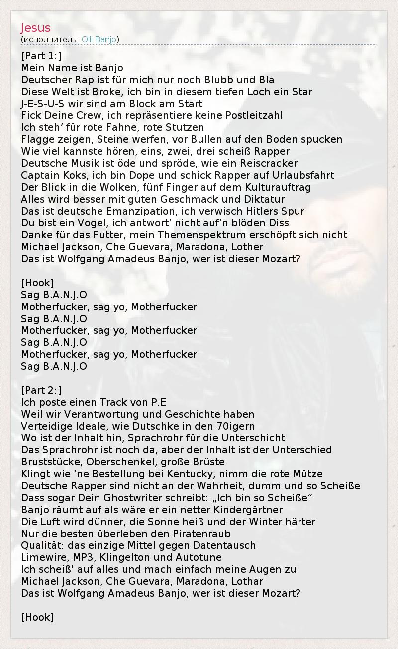 [Part 1:] Mein Name ist Banjo Deutscher Rap ist für mich nur noch Blubb und Bla Diese Welt ist Broke, ich bin in diesem tiefen Loch ein Star J-E-S-U-S wir sind am Block am Start Fick Deine Crew, ich repräsentiere keine Postleitzahl Ich steh’ für rote Fahne, rote Stutzen Flagge zeigen, Steine werfen, vor Bullen auf den Boden spucken Wie viel kannste hören, eins, zwei, drei scheiß Rapper Deutsche Musik ist öde und spröde, wie ein Reiscracker Captain Koks, ich bin Dope und schick Rapper auf Urlaubsfahrt Der Blick in die Wolken, fünf Finger auf dem Kulturauftrag Alles wird besser mit guten Geschmack und Diktatur Das ist deutsche Emanzipation, ich verwisch Hitlers Spur Du bist ein Vogel, ich antwort’ nicht auf’n blöden Diss Danke für das Futter, mein Themenspektrum erschöpft sich nicht Michael Jackson, Che Guevara, Maradona, Lother Das ist Wolfgang Amadeus Banjo, wer ist dieser Mozart? [Hook] Sag B.A.N.J.O Motherfucker, sag yo, Motherfucker Sag B.A.N.J.O Motherfucker, sag yo, Motherfucker Sag B.A.N.J.O Motherfucker, sag yo, Motherfucker Sag B.A.N.J.O [Part 2:] Ich poste einen Track von P.E Weil wir Verantwortung und Geschichte haben Verteidige Ideale, wie Dutschke in den 70igern Wo ist der Inhalt hin, Sprachrohr für die Unterschicht Das Sprachrohr ist noch da, aber der Inhalt ist der Unterschied Bruststücke, Oberschenkel, große Brüste Klingt wie ’ne Bestellung bei Kentucky, nimm die rote Mütze Deutsche Rapper sind nicht an der Wahrheit, dumm und so Scheiße Dass sogar Dein Ghostwriter schreibt: „Ich bin so Scheiße“ Banjo räumt auf als wäre er ein netter Kindergärtner Die Luft wird dünner, die Sonne heiß und der Winter härter Nur die besten überleben den Piratenraub Qualität: das einzige Mittel gegen Datentausch Limewire, MP3, Klingelton und Autotune Ich scheiß' auf alles und mach einfach meine Augen zu Michael Jackson, Che Guevara, Maradona, Lothar Das ist Wolfgang Amadeus Banjo, wer ist dieser Mozart? [Hook]
