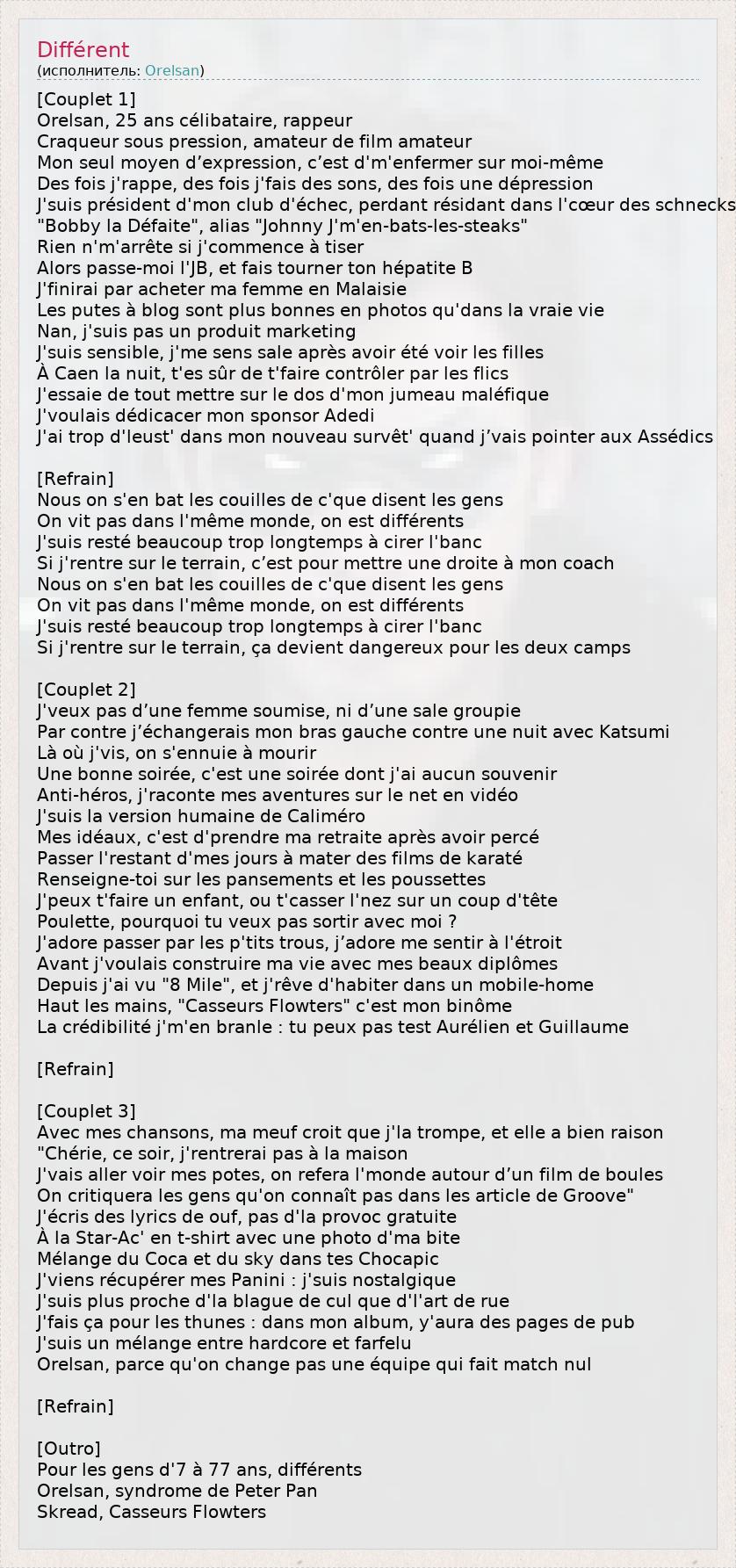[Couplet 1] Orelsan, 25 ans célibataire, rappeur Craqueur sous pression, amateur de film amateur Mon seul moyen d’expression, c’est d'm'enfermer sur moi-même Des fois j'rappe, des fois j'fais des sons, des fois une dépression J'suis président d'mon club d'échec, perdant résidant dans l'cœur des schnecks "Bobby la Défaite", alias "Johnny J'm'en-bats-les-steaks" Rien n'm'arrête si j'commence à tiser Alors passe-moi l'JB, et fais tourner ton hépatite B J'finirai par acheter ma femme en Malaisie Les putes à blog sont plus bonnes en photos qu'dans la vraie vie Nan, j'suis pas un produit marketing J'suis sensible, j'me sens sale après avoir été voir les filles À Caen la nuit, t'es sûr de t'faire contrôler par les flics J'essaie de tout mettre sur le dos d'mon jumeau maléfique J'voulais dédicacer mon sponsor Adedi J'ai trop d'leust' dans mon nouveau survêt' quand j’vais pointer aux Assédics [Refrain] Nous on s'en bat les couilles de c'que disent les gens On vit pas dans l'même monde, on est différents J'suis resté beaucoup trop longtemps à cirer l'banc Si j'rentre sur le terrain, c’est pour mettre une droite à mon coach Nous on s'en bat les couilles de c'que disent les gens On vit pas dans l'même monde, on est différents J'suis resté beaucoup trop longtemps à cirer l'banc Si j'rentre sur le terrain, ça devient dangereux pour les deux camps [Couplet 2] J'veux pas d’une femme soumise, ni d’une sale groupie Par contre j’échangerais mon bras gauche contre une nuit avec Katsumi Là où j'vis, on s'ennuie à mourir Une bonne soirée, c'est une soirée dont j'ai aucun souvenir Anti-héros, j'raconte mes aventures sur le net en vidéo J'suis la version humaine de Caliméro Mes idéaux, c'est d'prendre ma retraite après avoir percé Passer l'restant d'mes jours à mater des films de karaté Renseigne-toi sur les pansements et les poussettes J'peux t'faire un enfant, ou t'casser l'nez sur un coup d'tête Poulette, pourquoi tu veux pas sortir avec moi ? J'adore passer par les p'tits trous, j’adore me sentir à l'étroit Avant j'voulais construire ma vie avec mes beaux diplômes Depuis j'ai vu "8 Mile", et j'rêve d'habiter dans un mobile-home Haut les mains, "Casseurs Flowters" c'est mon binôme La crédibilité j'm'en branle : tu peux pas test Aurélien et Guillaume [Refrain] [Couplet 3] Avec mes chansons, ma meuf croit que j'la trompe, et elle a bien raison "Chérie, ce soir, j'rentrerai pas à la maison J'vais aller voir mes potes, on refera l'monde autour d’un film de boules On critiquera les gens qu'on connaît pas dans les article de Groove" J'écris des lyrics de ouf, pas d'la provoc gratuite À la Star-Ac' en t-shirt avec une photo d'ma bite Mélange du Coca et du sky dans tes Chocapic J'viens récupérer mes Panini : j'suis nostalgique J'suis plus proche d'la blague de cul que d'l'art de rue J'fais ça pour les thunes : dans mon album, y'aura des pages de pub J'suis un mélange entre hardcore et farfelu Orelsan, parce qu'on change pas une équipe qui fait match nul [Refrain] [Outro] Pour les gens d'7 à 77 ans, différents Orelsan, syndrome de Peter Pan Skread, Casseurs Flowters