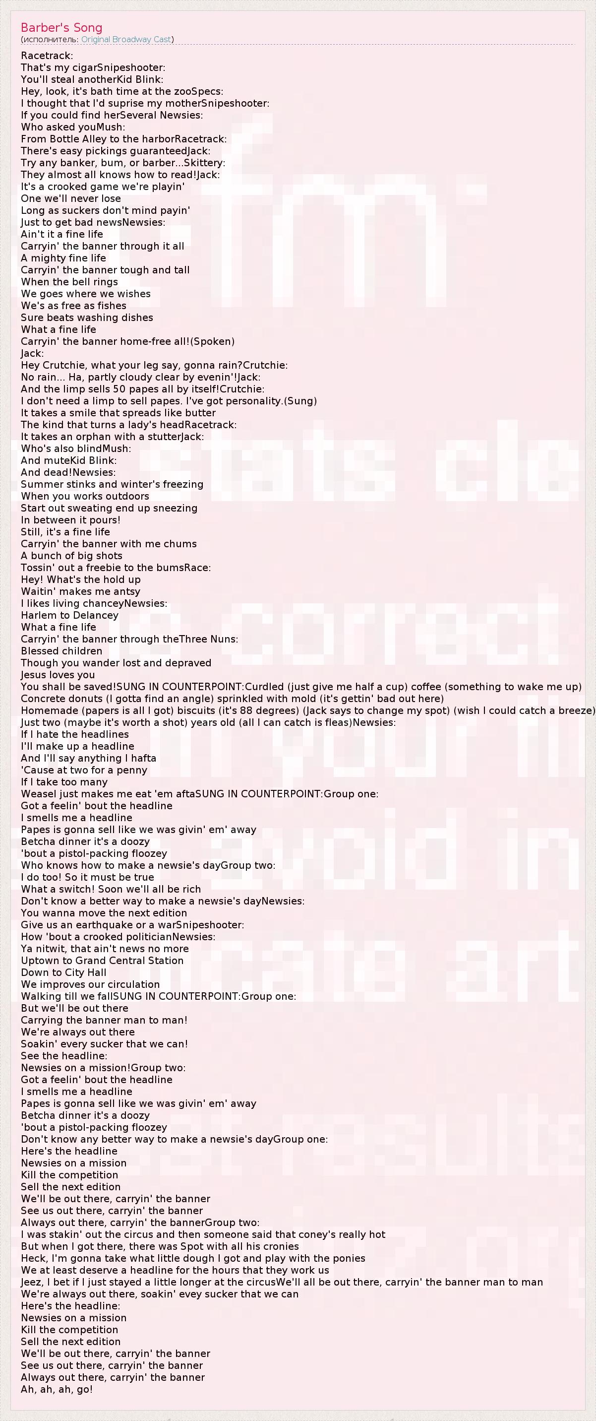 Racetrack: That's my cigarSnipeshooter: You'll steal anotherKid Blink: Hey, look, it's bath time at the zooSpecs: I thought that I'd suprise my motherSnipeshooter: If you could find herSeveral Newsies: Who asked youMush: From Bottle Alley to the harborRacetrack: There's easy pickings guaranteedJack: Try any banker, bum, or barber...Skittery: They almost all knows how to read!Jack: It's a crooked game we're playin' One we'll never lose Long as suckers don't mind payin' Just to get bad newsNewsies: Ain't it a fine life Carryin' the banner through it all A mighty fine life Carryin' the banner tough and tall When the bell rings We goes where we wishes We's as free as fishes Sure beats washing dishes What a fine life Carryin' the banner home-free all!(Spoken) Jack: Hey Crutchie, what your leg say, gonna rain?Crutchie: No rain... Ha, partly cloudy clear by evenin'!Jack: And the limp sells 50 papes all by itself!Crutchie: I don't need a limp to sell papes. I've got personality.(Sung) It takes a smile that spreads like butter The kind that turns a lady's headRacetrack: It takes an orphan with a stutterJack: Who's also blindMush: And muteKid Blink: And dead!Newsies: Summer stinks and winter's freezing When you works outdoors Start out sweating end up sneezing In between it pours! Still, it's a fine life Carryin' the banner with me chums A bunch of big shots Tossin' out a freebie to the bumsRace: Hey! What's the hold up Waitin' makes me antsy I likes living chanceyNewsies: Harlem to Delancey What a fine life Carryin' the banner through theThree Nuns: Blessed children Though you wander lost and depraved Jesus loves you You shall be saved!SUNG IN COUNTERPOINT:Curdled (just give me half a cup) coffee (something to wake me up) Concrete donuts (I gotta find an angle) sprinkled with mold (it's gettin' bad out here) Homemade (papers is all I got) biscuits (it's 88 degrees) (Jack says to change my spot) (wish I could catch a breeze) Just two (maybe it's worth a shot) years old (all I can catch is fleas)Newsies: If I hate the headlines I'll make up a headline And I'll say anything I hafta 'Cause at two for a penny If I take too many Weasel just makes me eat 'em aftaSUNG IN COUNTERPOINT:Group one: Got a feelin' bout the headline I smells me a headline Papes is gonna sell like we was givin' em' away Betcha dinner it's a doozy 'bout a pistol-packing floozey Who knows how to make a newsie's dayGroup two: I do too! So it must be true What a switch! Soon we'll all be rich Don't know a better way to make a newsie's dayNewsies: You wanna move the next edition Give us an earthquake or a warSnipeshooter: How 'bout a crooked politicianNewsies: Ya nitwit, that ain't news no more Uptown to Grand Central Station Down to City Hall We improves our circulation Walking till we fallSUNG IN COUNTERPOINT:Group one: But we'll be out there Carrying the banner man to man! We're always out there Soakin' every sucker that we can! See the headline: Newsies on a mission!Group two: Got a feelin' bout the headline I smells me a headline Papes is gonna sell like we was givin' em' away Betcha dinner it's a doozy 'bout a pistol-packing floozey Don't know any better way to make a newsie's dayGroup one: Here's the headline Newsies on a mission Kill the competition Sell the next edition We'll be out there, carryin' the banner See us out there, carryin' the banner Always out there, carryin' the bannerGroup two: I was stakin' out the circus and then someone said that coney's really hot But when I got there, there was Spot with all his cronies Heck, I'm gonna take what little dough I got and play with the ponies We at least deserve a headline for the hours that they work us Jeez, I bet if I just stayed a little longer at the circusWe'll all be out there, carryin' the banner man to man We're always out there, soakin' evey sucker that we can Here's the headline: Newsies on a mission Kill the competition Sell the next edition We'll be out there, carryin' the banner See us out there, carryin' the banner Always out there, carryin' the banner Ah, ah, ah, go!