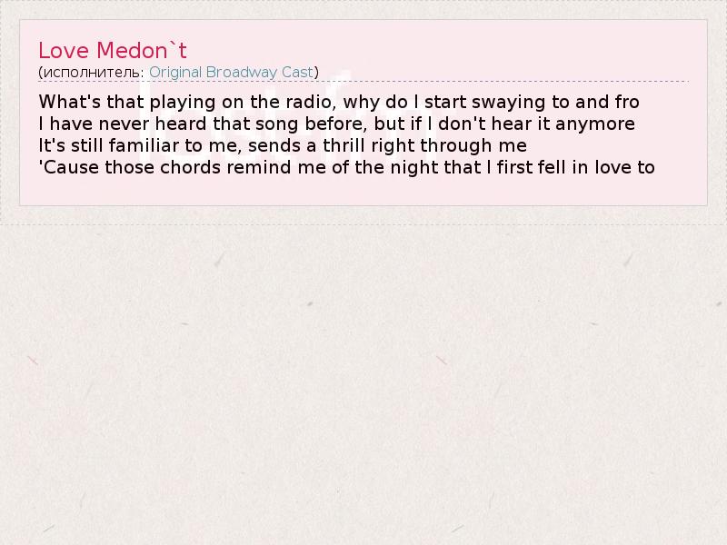 What's that playing on the radio, why do I start swaying to and fro I have never heard that song before, but if I don't hear it anymore It's still familiar to me, sends a thrill right through me 'Cause those chords remind me of the night that I first fell in love to